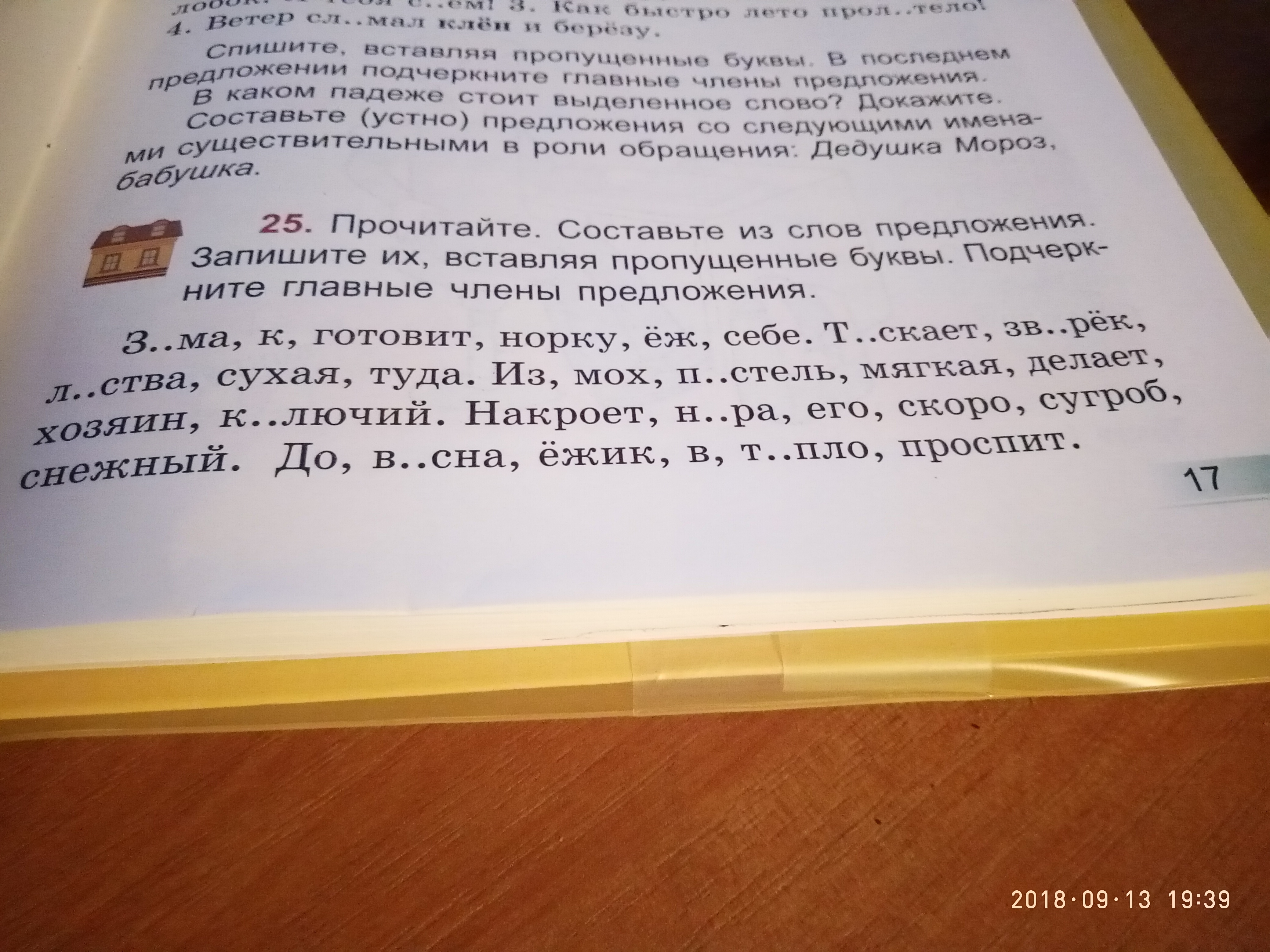 Ёж себе готовит норку к зиме. (еж- подлежащее , готовит- сказуемое)Туда зверёк таскает сухую листву. ( зверек -подлежащее, таскает-сказуемое)Мягкую постель колючий хозяин делает из мха.(хозяин-подлежащее, делает- сказуемое) С кого его нору накроет снежный сугроб.( сугроб- подлежащее, накроет- сказуемое) Ёжик просит в тепле до весны.( ежик- подлежащее, проспит- сказуемое)