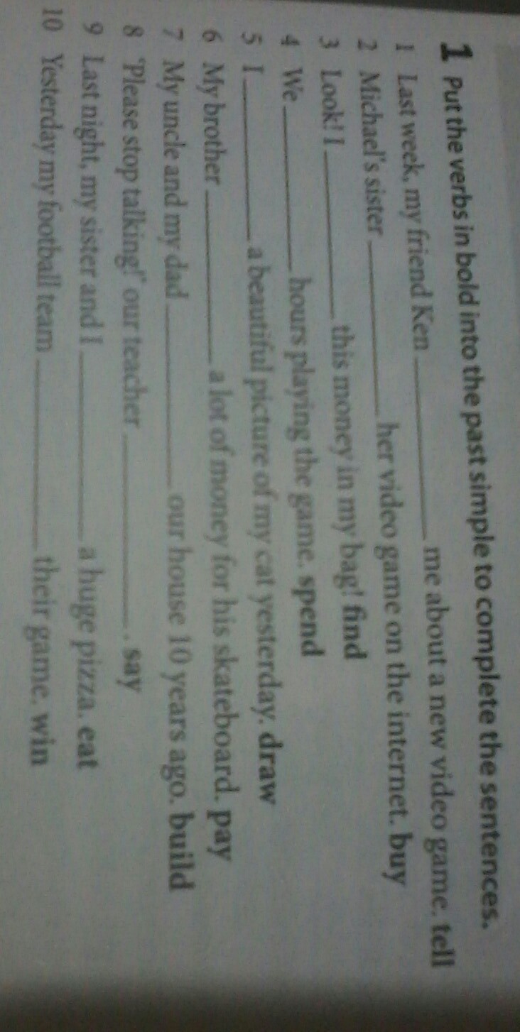 1) told. / 2) bought. / 3) found. / 4) spent. / 5) drew. / 6) paid. / 7) built. / 8) said. / 9) ate. / 10) won.