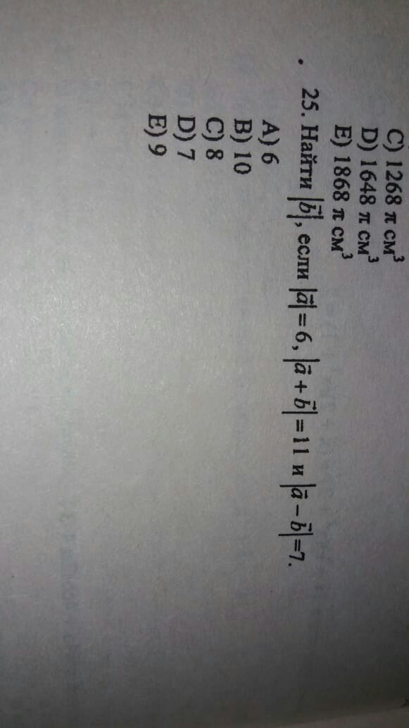 сумма векторов-это одна диагональ параллелограмма со сторонами |a| и |b|, разность векторов-вторая диагональ... по т.косинусов: 11^2=6^2+х^2-2*6х*cos(a) ---> 12х*cos(a)=x^2-85 7^2=6^2+х^2-2*6х*cos(180°-a) ---> 13=х^2-12х*(-cos(a)) 13=x^2+х^2-85 х^2=49 х=7=|b| Ответ: D)
