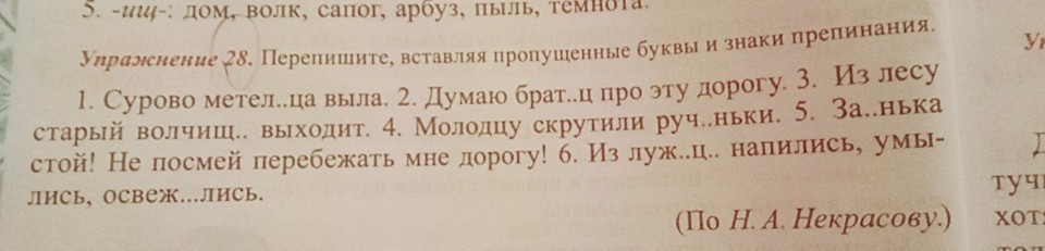 1. Сурово метелица выла. 2. Думаю, братец, про эту дорогу. 3. Из лесу старый волчище выходит. 4. Молодцы скрутили рученьки. 5. Заинька, стой! Не посмей перебежать мне дорогу. 6. Из лужицы напились, умылись, осветились.