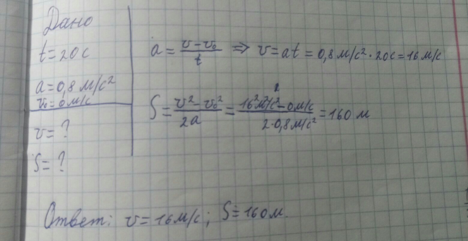 Лыжник съезжает с горы за t=20c двигаясь с ускорением a=0,8 м/с^2 , начальная скорость лыжника v0=0.Определите:1)v— скорость лыжника в конце спуска; 2) S— длину спуска.