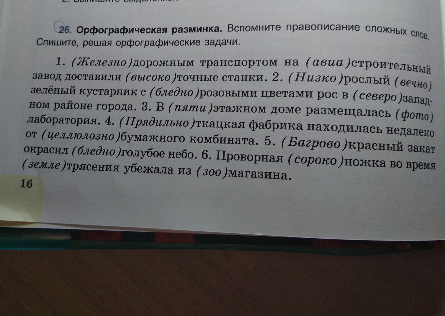 4. Прядильно-ткацкая фабрика находилась недалеко от целлюлозно-бумажного комбината. 5. Багрово-красный закат окрасил бледно-голубое небо. 6. Проворная сороконожка во время землетрясения убежала из зоомагазина.