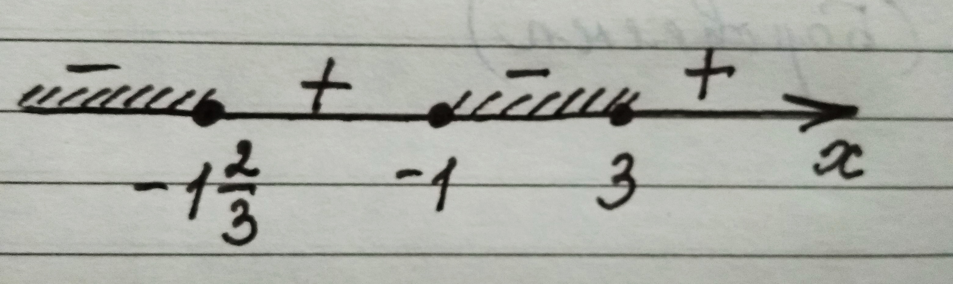 Решение: Приравняв к нулю каждый множитель, Вы найдёте корни уравнения (3x+5)(x-3)(x+1) = 0. У нас в условии неравенство. Его удобно решить методом интервалов. (3x+5)(x-3)(x+1) ≤ 0; 3•(x+5/3)(x-3)(x+1) ≤ 0; (x + 1 2/3)(x-3)(x+1) ≤ 0; (Числовая прямая со знаками на каждом интервале в приложенном изображении ) x∊ (- ∞ ; - 1 2/3] ∪ [-1;3].