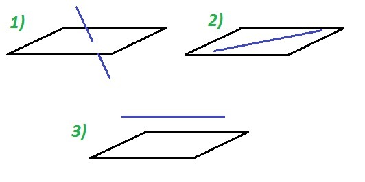 Прямая и плоскость могут не иметь общих точек, иметь одну общую точку либо бесконечное множество общих точек.