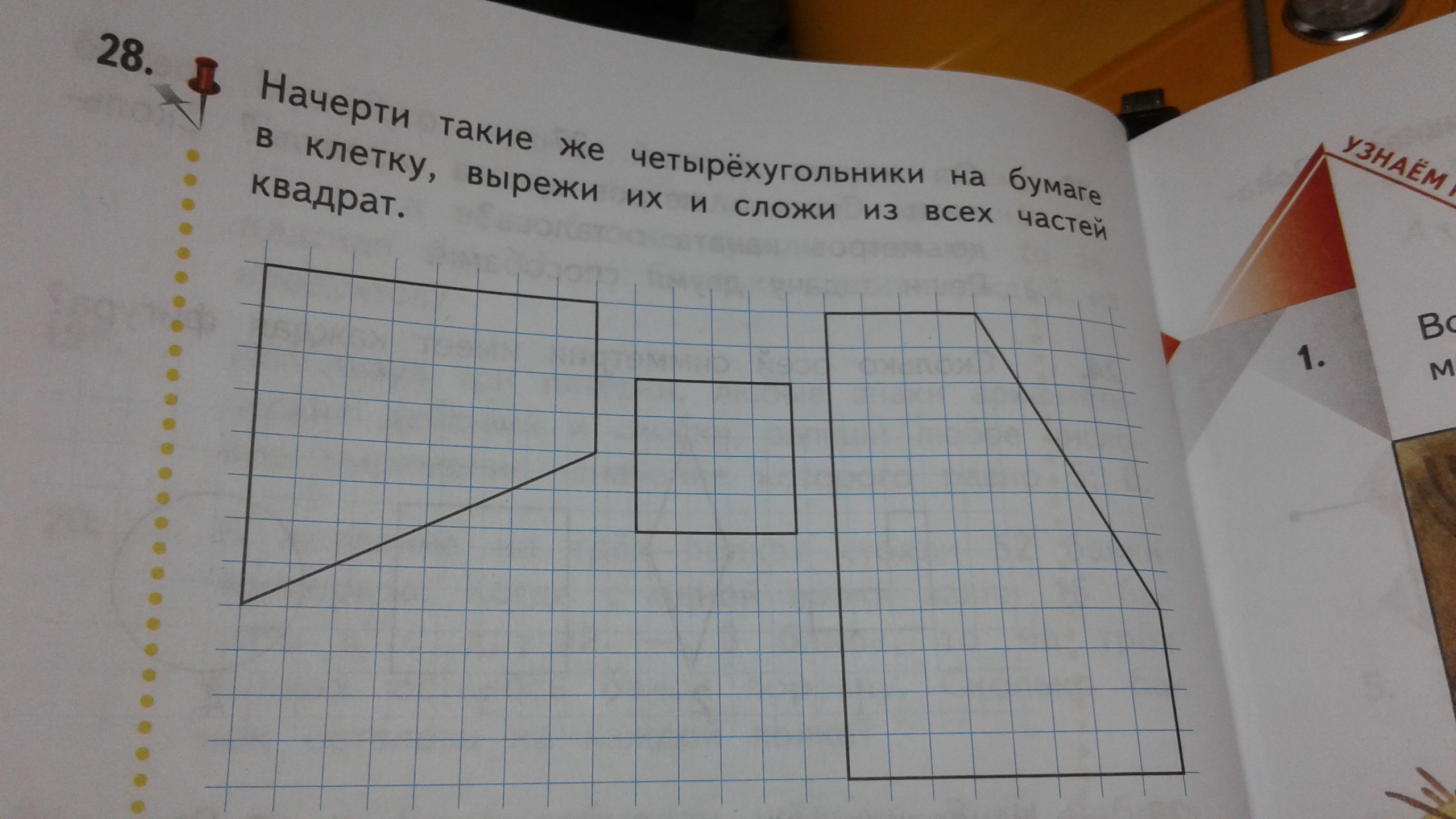 Начерти такие же чеырехуголники на бумаге в клетку,вырежи их и сложи из всех частей квадрат.