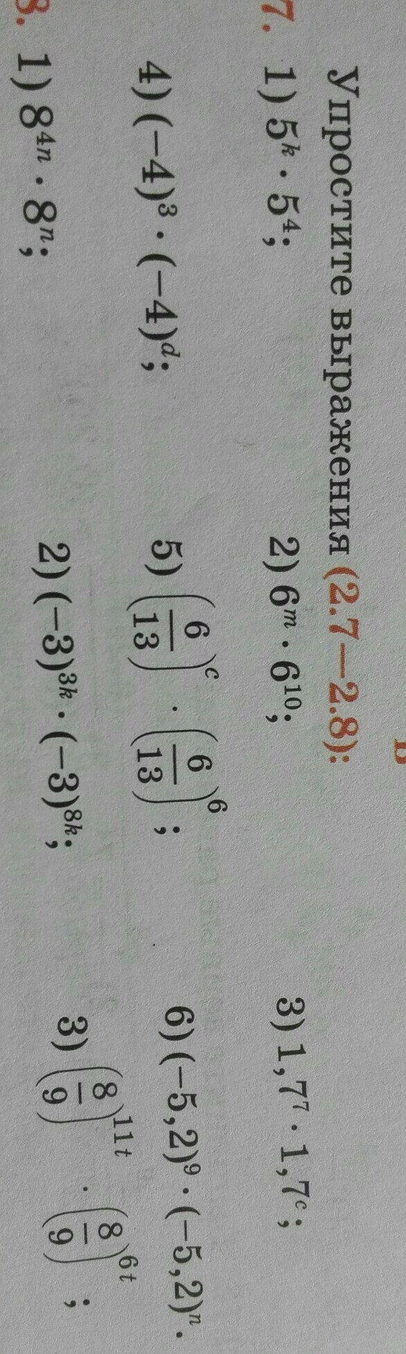 1)5^k+4 2)6^m+10 3)1,7^7+c 4)(-4)^3+d 5)(6÷13)^c+6 6)(-5,2)^9+n 1)8^5n 2)(-3)^11k 3)(9÷8)^17t
