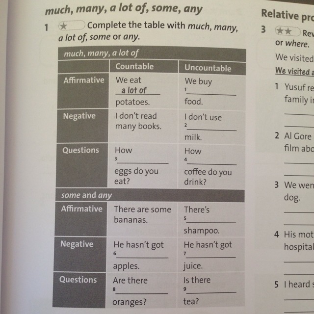 We buy many food. I don't use much milk. How many eggs do you eat? How much coffee do you drink? There's some shampoo. He hasn't got any apples. He hasn't got some juice. Are there any oranges? Is there some tea?