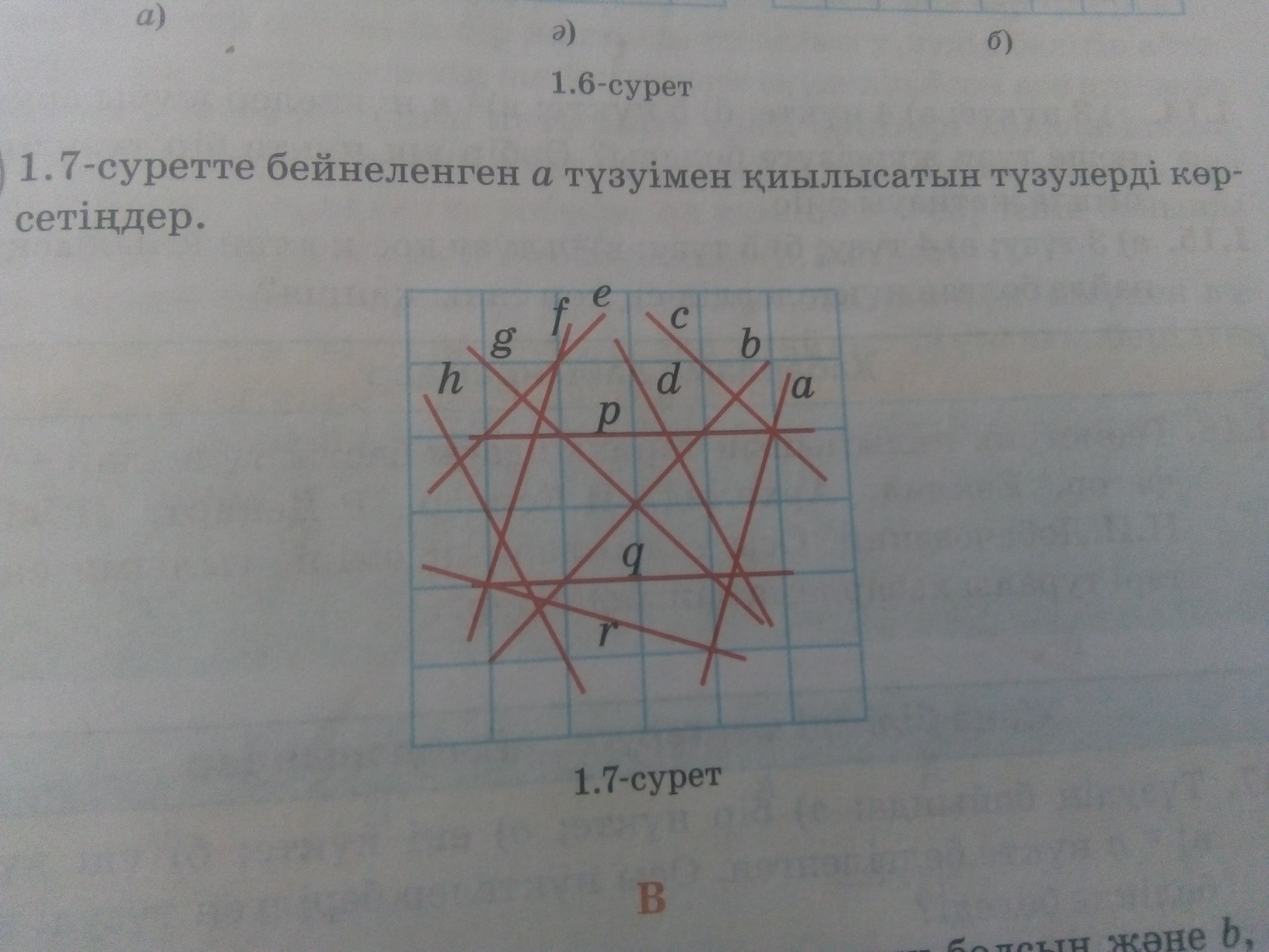 p , c , d , q, g, r. Егер бір жазықтықта жатқан түзу шексіз болатынын ескерсек, онда f түзуінен басқасының бәрі "a" түзуімен қиылысады.