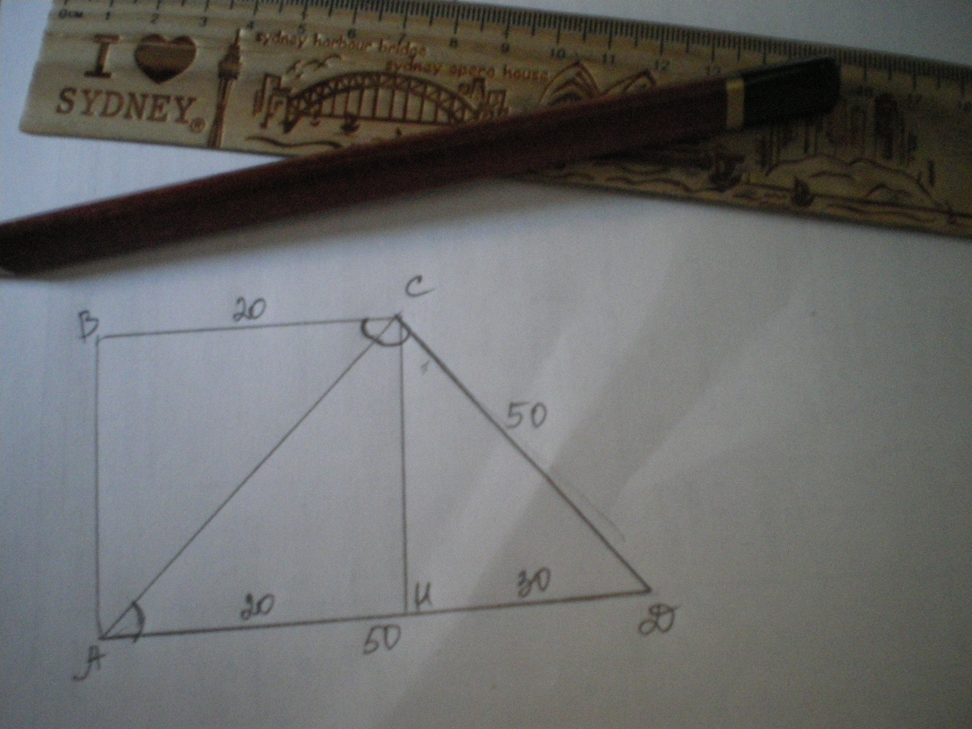 Проведем высоту СН. АН=ВС=20 см, ДН=АД-АН=50-20=30 см.
