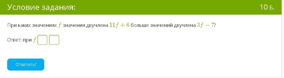 При каких значениях f значения двучлена 11f+6 больше значений двучлена 3f−7?