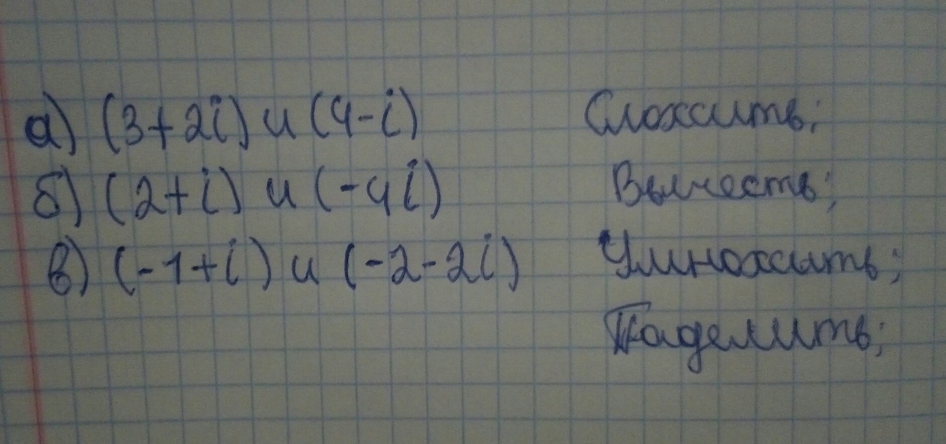 3.(-1+і)+(-2-2і)=-1-2+і-2і=-1-і, (-1+і)-(-2-2і)=(-1+2)+(і+2і)=1+3і сложение и вычитание