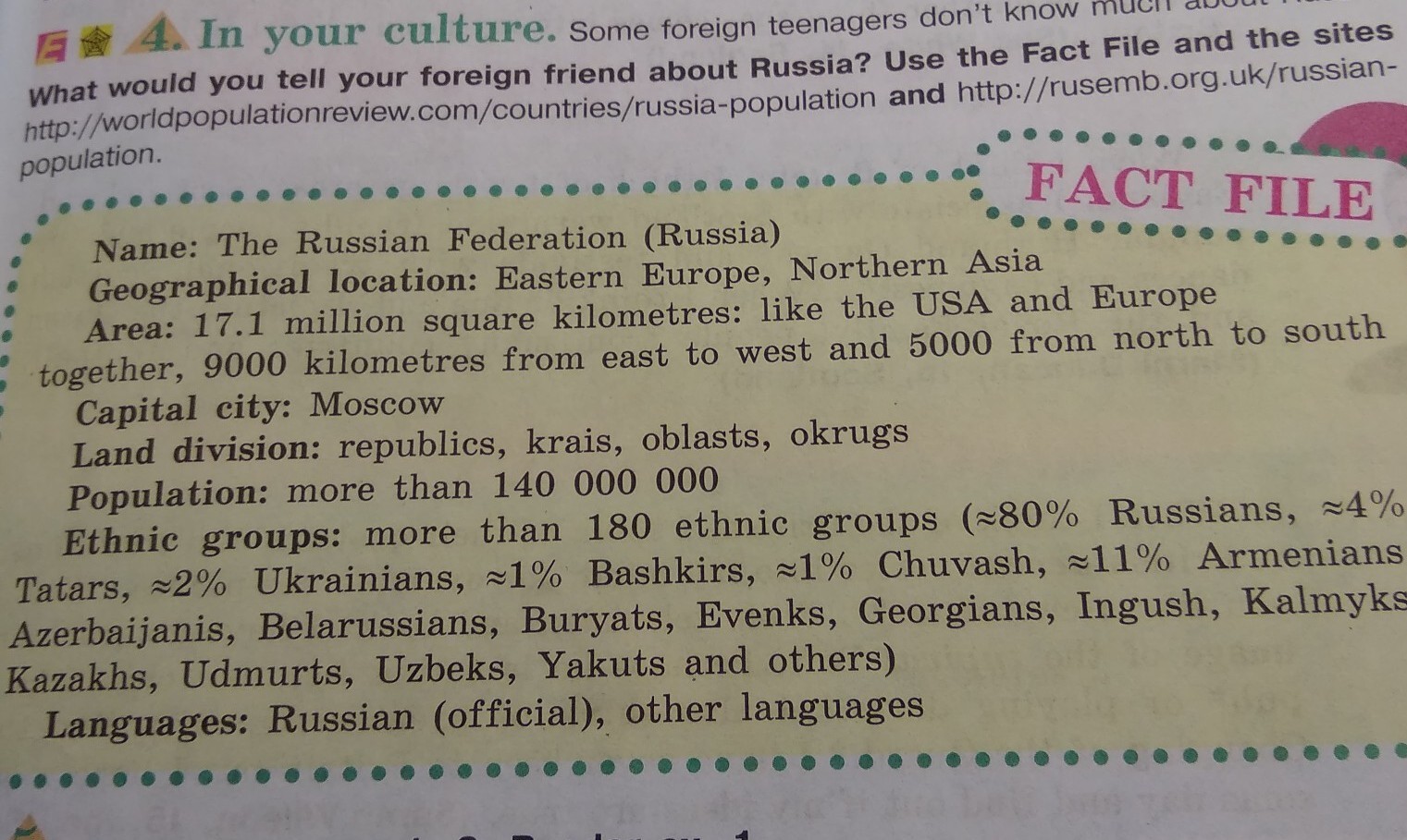 The Russian Federation or Russia is located in Eastern Europe and Northern Asia. Its capital is Moscow. Russia is the biggest country in the world. The surface area is 17.1 million square kilometers like the USA and Europe together, 9000 kilometers from east to west and 5000 from north to south. Population is more than 140 000 000 people, there are ~80% Russians, ~4% Tatars, ~2% Ukrainians, ~1% Bashkirs, ~1% Chuvash, ~11% Armenians, Azerbaijanis and etc (и т.д.). That consists of republics, krais, oblasts, okrugs. The official language is Russian but has many other languages.