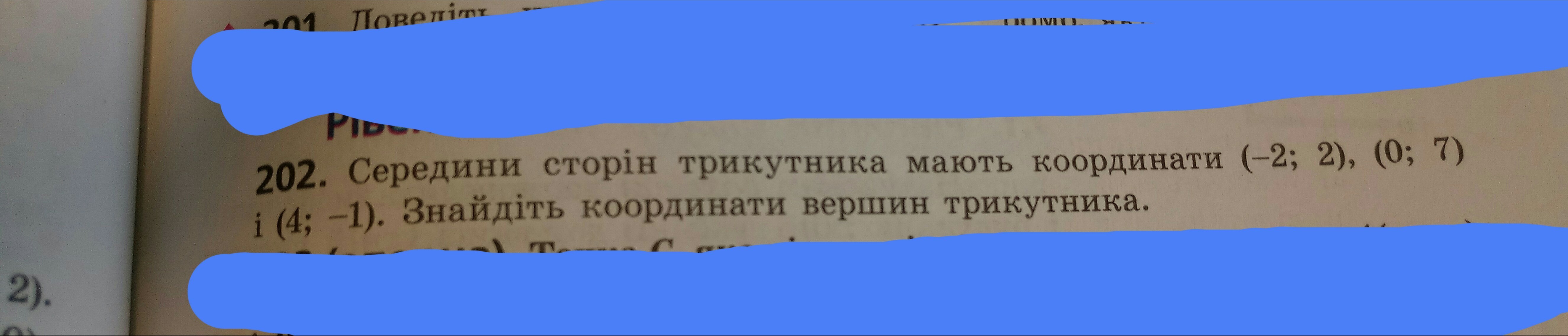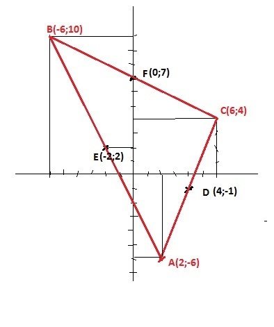 Пусть точка Е(-2;2) - середина стороны АВ, Точка F(0;7) - середина стороны ВС и точка D(4;-1) - середина стороны АС.