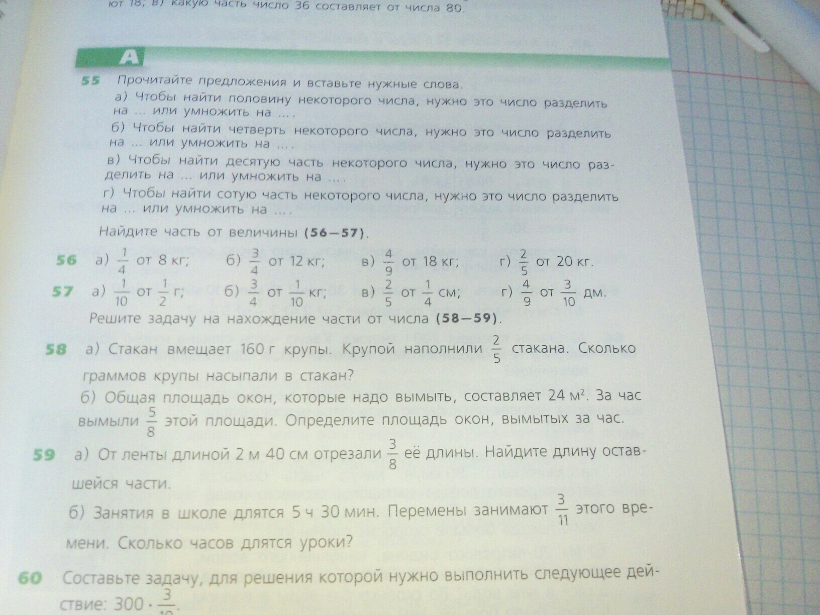 58 номер ответ 64 грамма 160÷5= 32 >>32×2=64 15 метров окон помыли за 1 час 59 номер а)150 см б)уроки длятся 4 часа