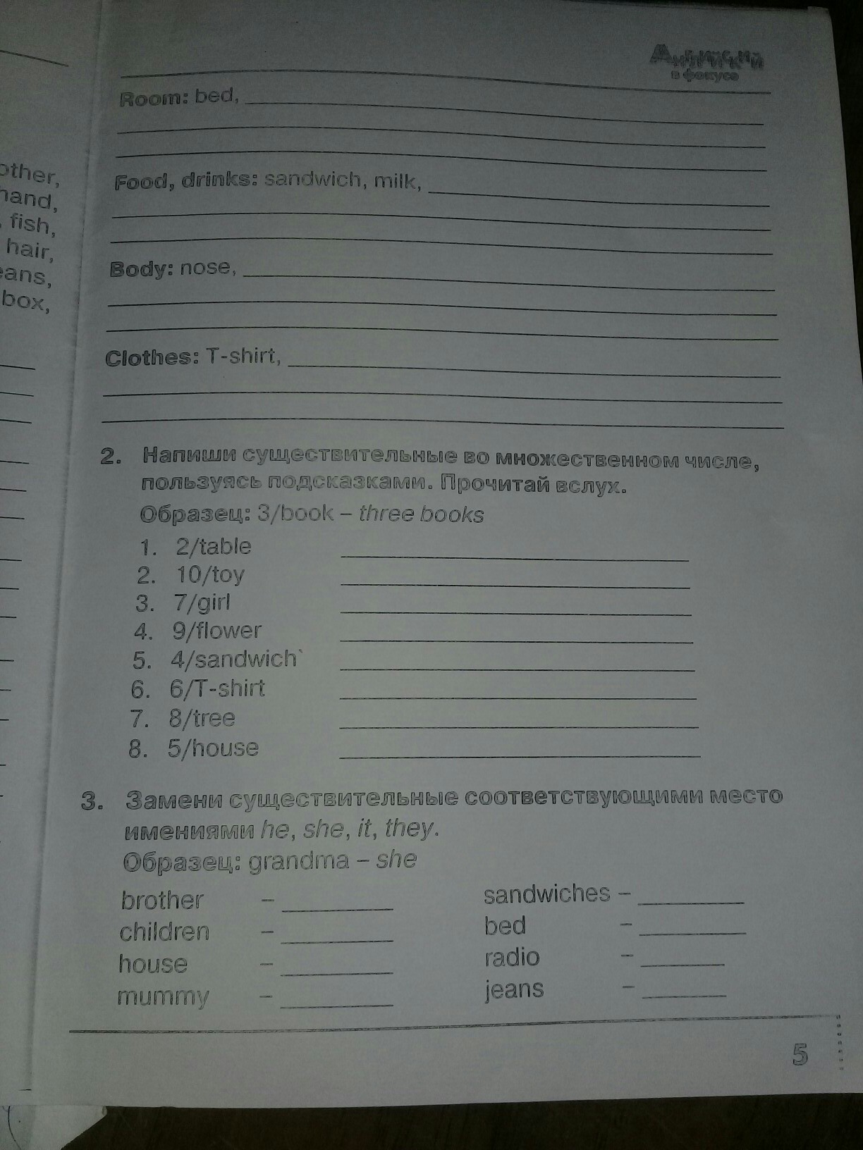 2. Two tables Ten toes Seven girls Nine colors Four sandwiches Six T-shirts Eight trees Five houses 3. Brother-he Children-they House-it Mummy-she Sandwiches-then Bed-it Radio-it Jeans-then