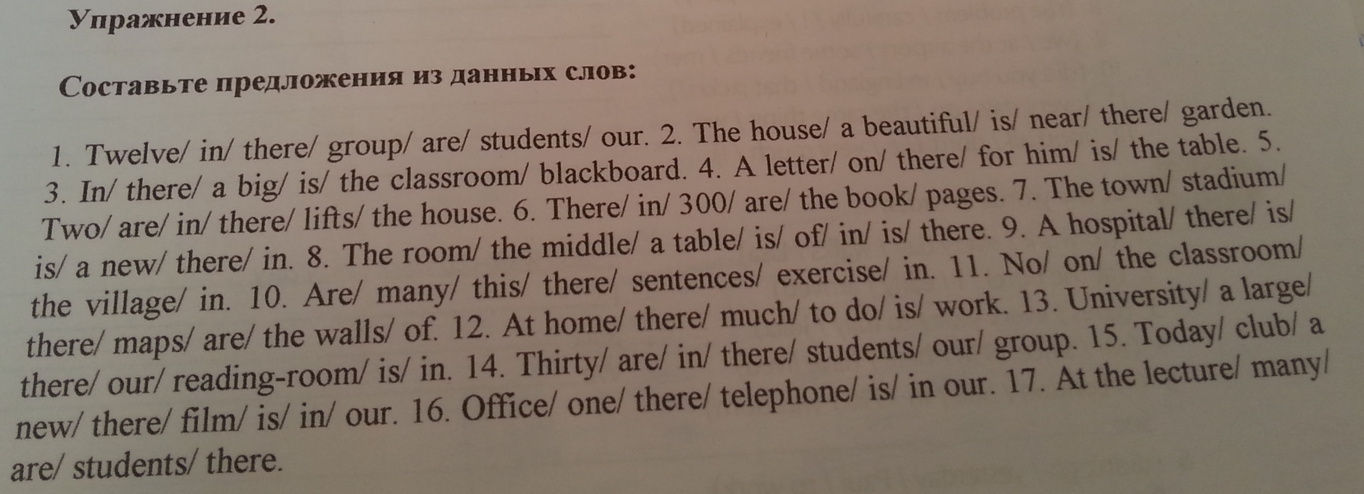 1. There are twelve students in our group. 2. There is a beautiful garden near the house. 3. There is a big blackboard in the classroom. 4. There is a letter for him on the table. 5. There are two lifts in the house. 6. There are 300 pages in the book. 7. There is a new stadium in the town. 8. There is a table in the middle of the room. 9. There is a hospital in the village. 10. There are many sentences in this exercise. 11. There are no maps on the walls of the classroom. 12. There is much work to do at home. 13. There is a large reading-room in our University. 14. There are thirty students in our group. 15. There is a new film in our club today. 16. There is one telephone in our office. 17. There are many students at the lecture.