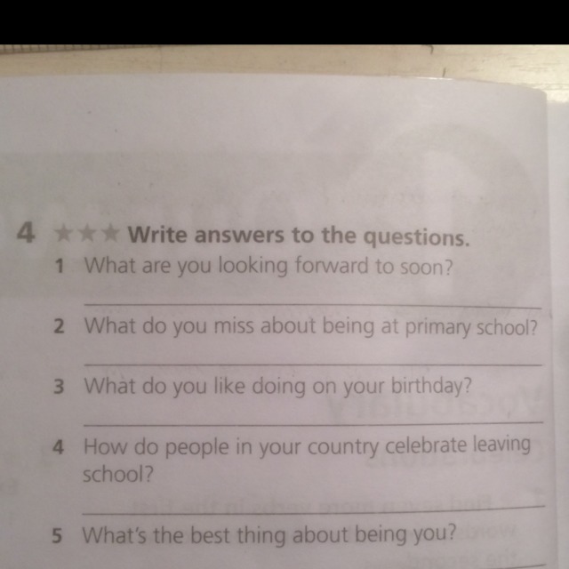 1.I expect to finish school in the top five. 2.School is good ,because you will learn a lot. 3.I always celebrate my birthday with my family and this is the most important thing for me. 4.they celebrate differently some walk and the rest make a party in a cafe. 5.the best thing in the world is that the parents were healthy and happy with me always.