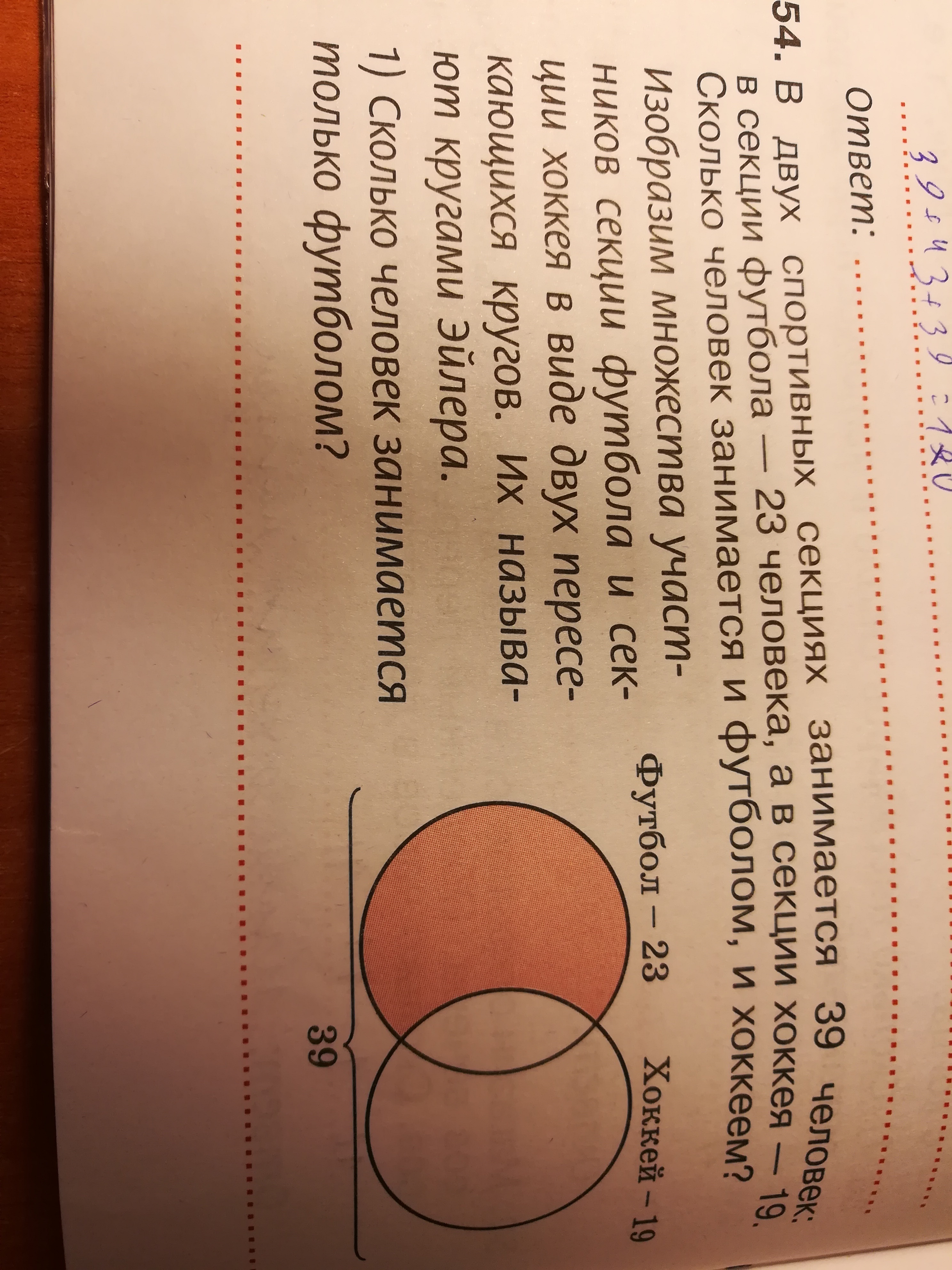 1) 23+19=42(чел)-занимаються в 2 секциях 2) 42-39=3(чел)-футболом и хокеем