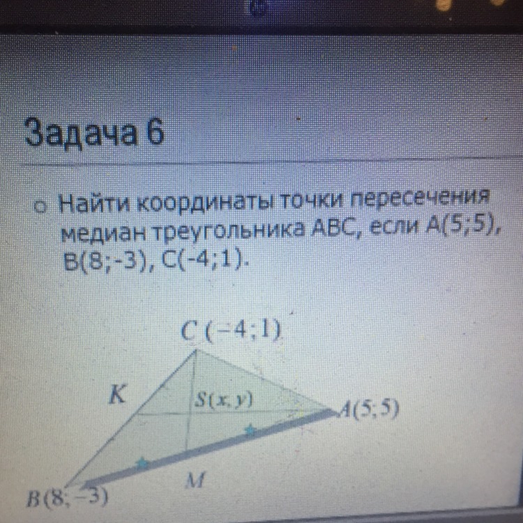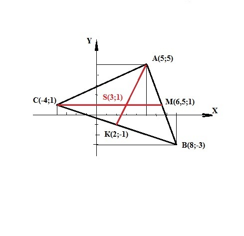 Найти координаты точки пересечения медианы треугольника АВС,если А(5;5), В(8;-3), С(-4;1)