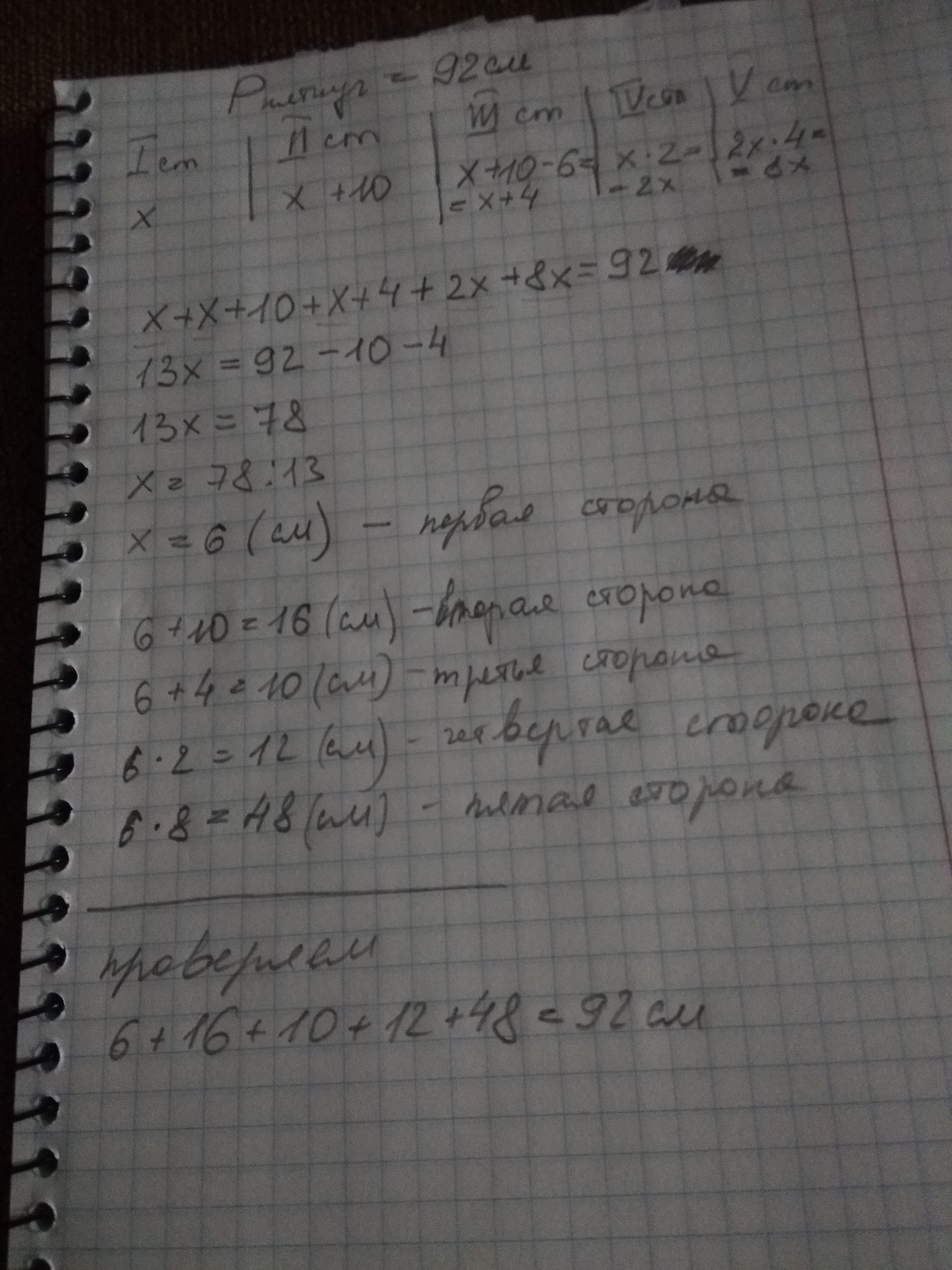 Найти каждую сторону 5-угольника, если его периметр равен 92 см. Вторая сторона больше 1-й на 10 см, 3-я короче 2-й на 6 см, 4-я длиннее 1-й в 2 раза и короче 5-й в 4 раза. (указание: 1-ю сторону обозначить за х)