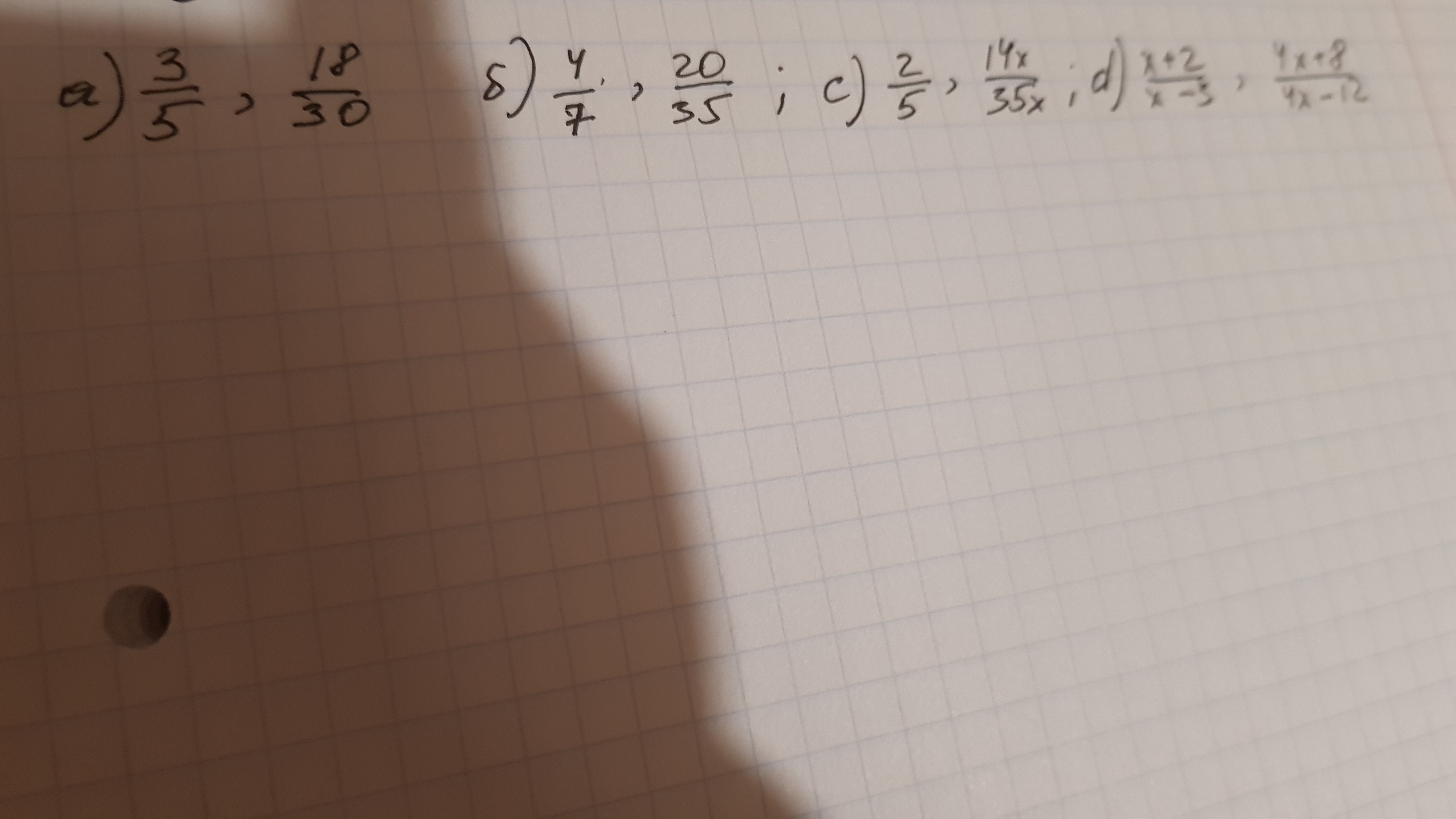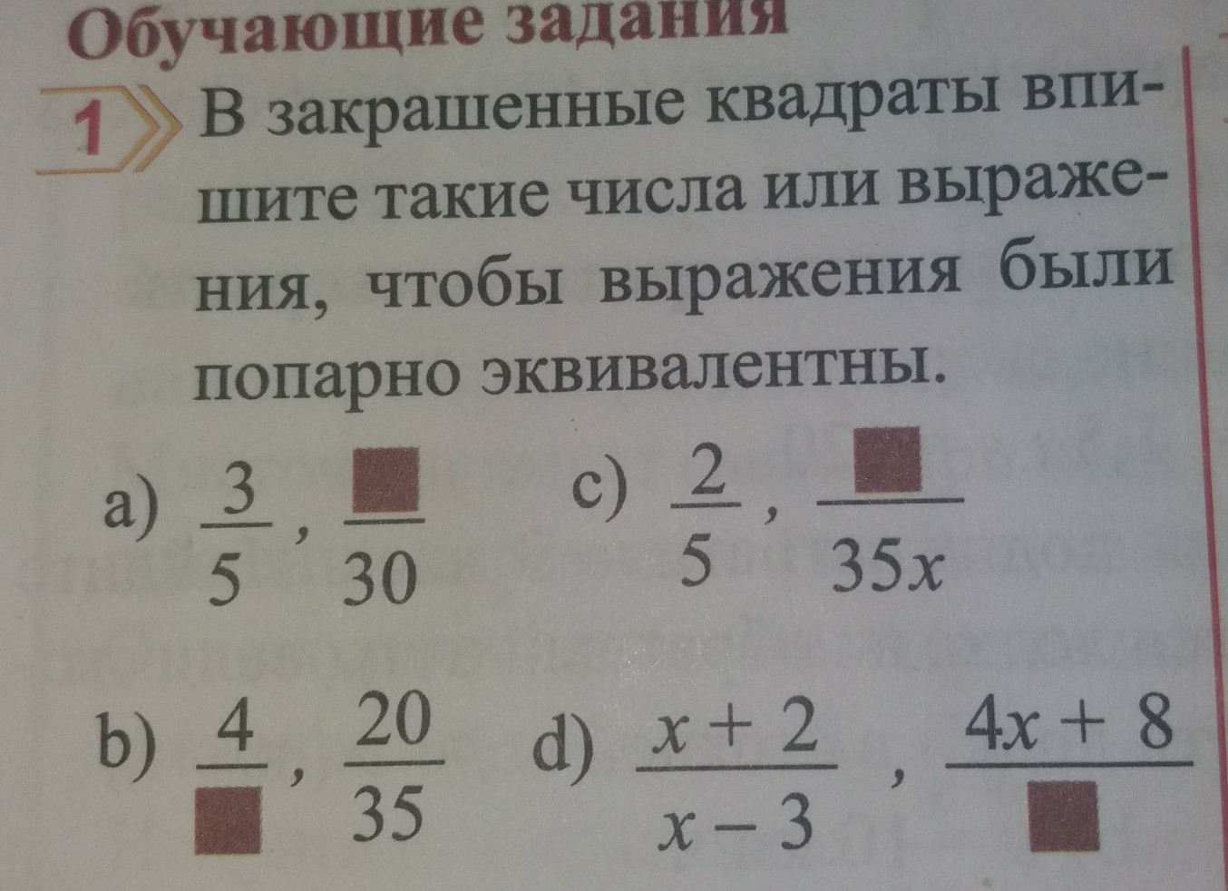 Решение в кратности, к примеру 3/5 и 18/30 просто 18/30=(3×6)/(5×6), то есть умножаем и верхнюю и нижнюю часть на одно и тоже число, так и с остальными примерами