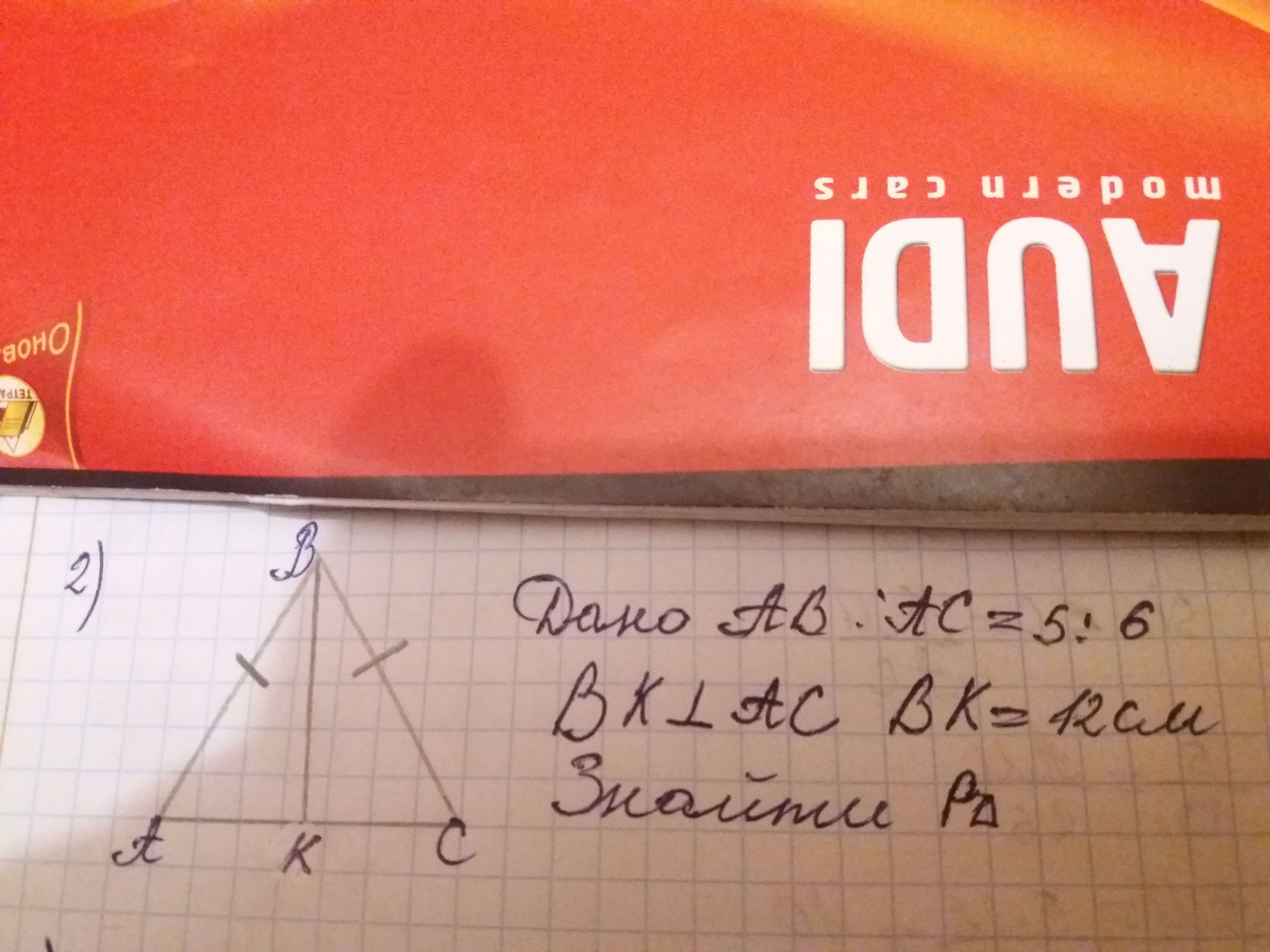 AB=5x=BC AC=6x BK=12=√(25x^2-(36x^2)/4)=x•√(25-36/4)=4x x=12/4=3 P=AB+BC+AC=5x+5x+6x=16x=16•3=48
