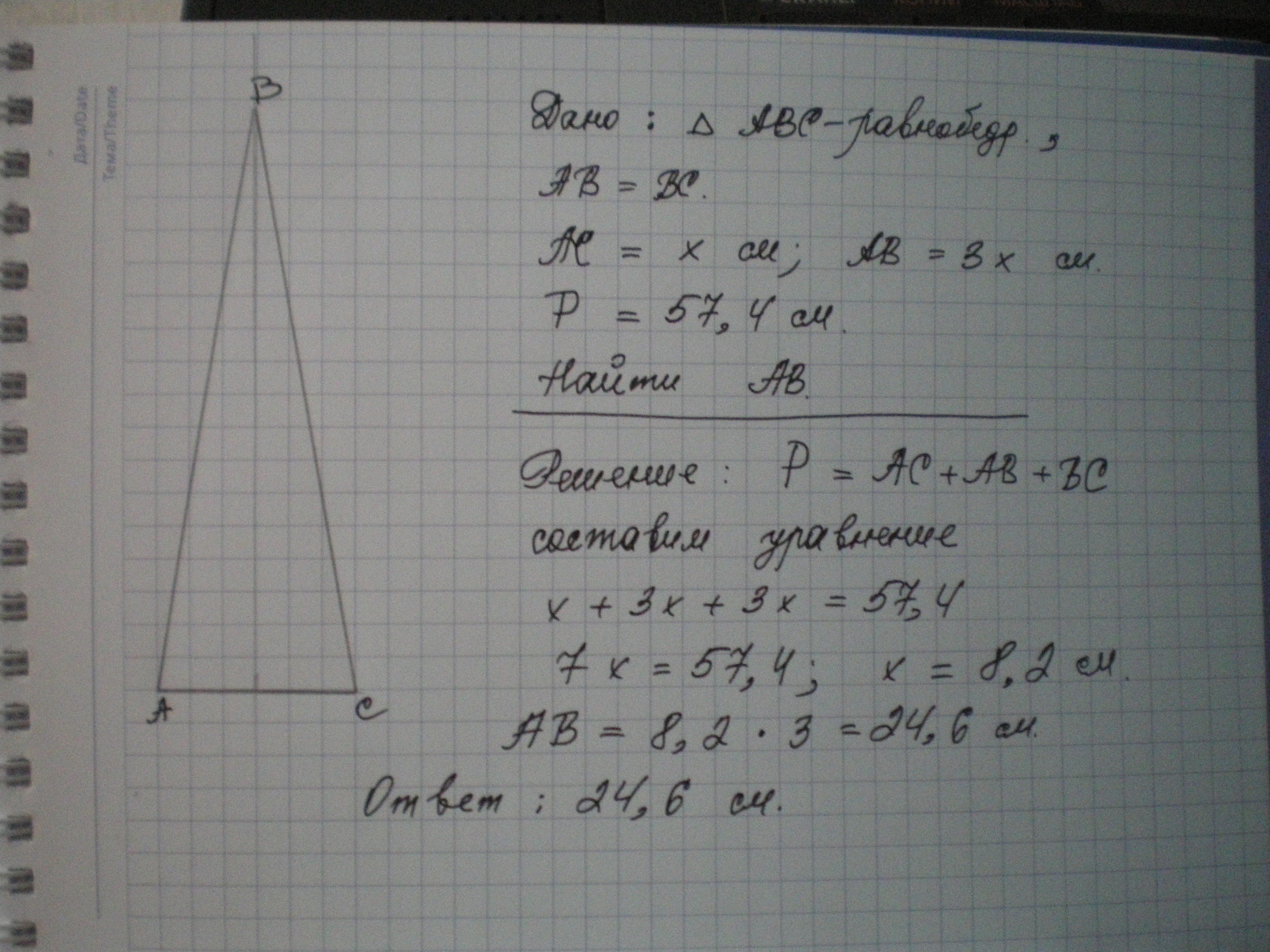 Основание равнобедренного треугольника в 3 раза меньше боковой стороны, а его периметр 57,4 см. Найдите боковую сторону