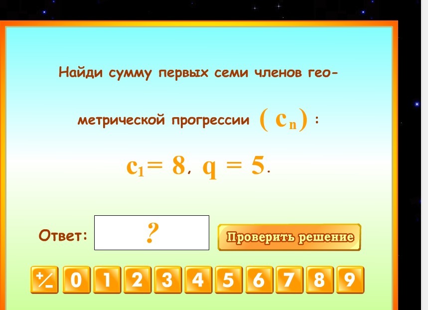 S7 = (c1*(1-q^n))/(1-q) = (8*(1-5^7))/(1-5) = 156248