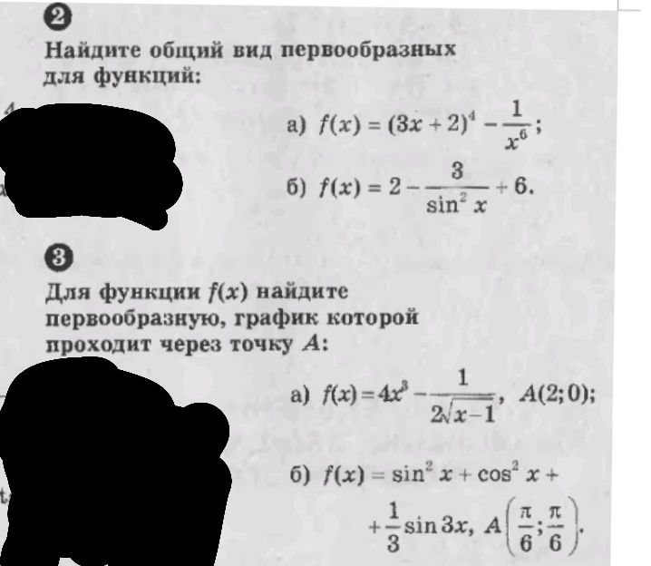 int f(x), dx=F(x)+C\\2a); ; int (, (3x+2)^4-frac{1}{x^6})dx=frac{1}{3}cdot frac{(3x+2)^5}{5}-frac{x^{-6+1}}{-6+1}+C=frac{(3x+2)^5}{15}+frac{1}{5x^5}+C, .\\2b); ; int (2-frac{3}{sin^2x}+6)dx=8x+3, ctgx+C.\\3a); ; F(x)=int (4x^3-frac{1}{2sqrt{x-1}})dx=x^4-sqrt{x-1}+C; ;\\A(2;0):; ; 0=2^4-sqrt{2-1}+C; ;; ; 0=16-1+C; ;; C=-15\\F(x)=x^4-sqrt{x-1}-15; .\\3b); ; F(x)=int (underbrace {sin^2x+cos^2x}_{1}+frac{1}{3}cdot sin3x)dx=int (1+frac{1}{3}cdot sin3x)dx=