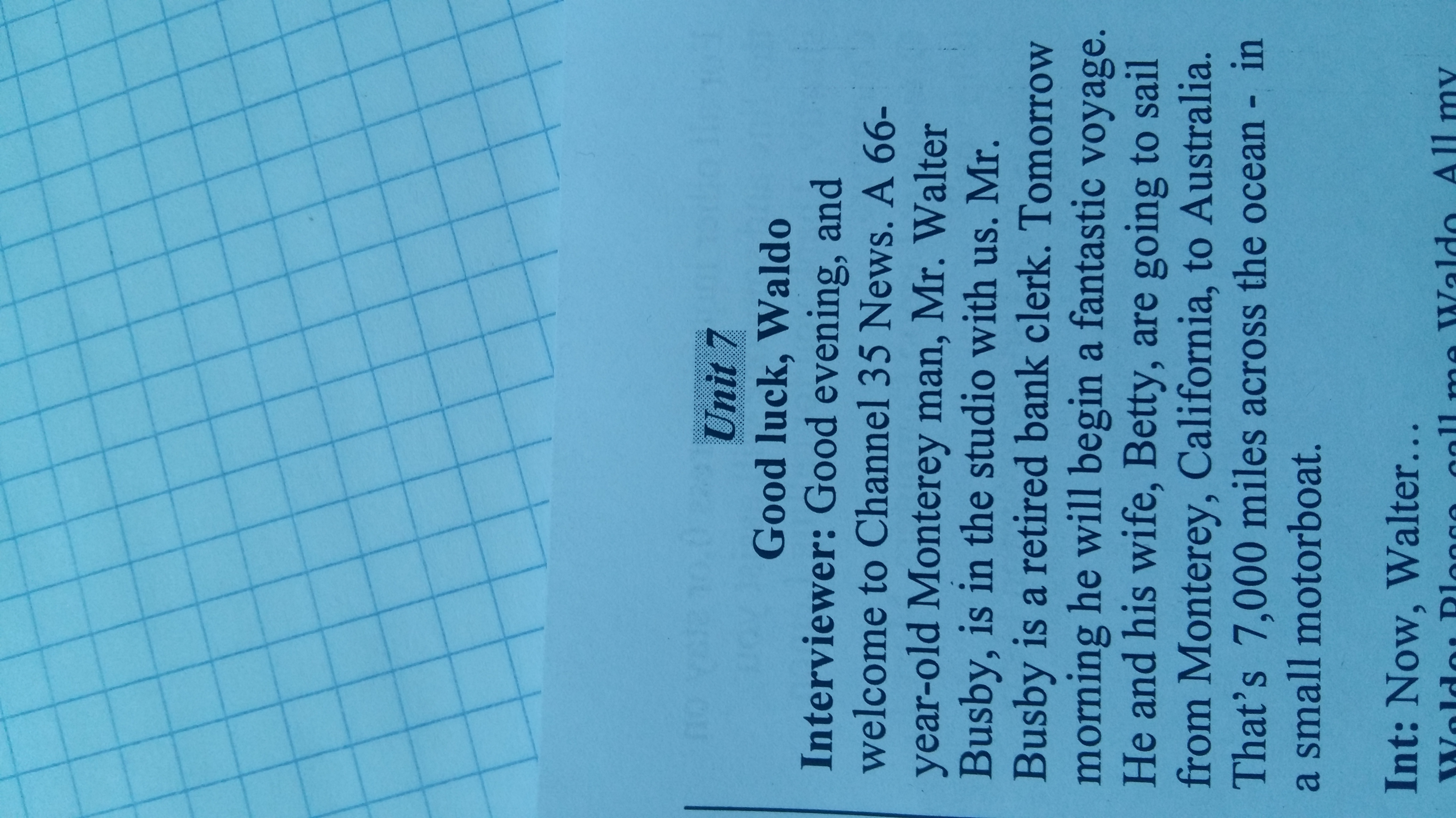 Interviewer: Good evening, and welcome to Channel 35 News. A 66- year-old Monterey man, Mr. Walter Busby, is in the studio with us. Mr. Busby is a retired bank clerk. Tomorrow morning he will begin a fantastic voyage. He and his wife, Betty, are going to sail from Monterey, California, to Australia. That's 7,000 miles across the ocean - in a small motorboat.