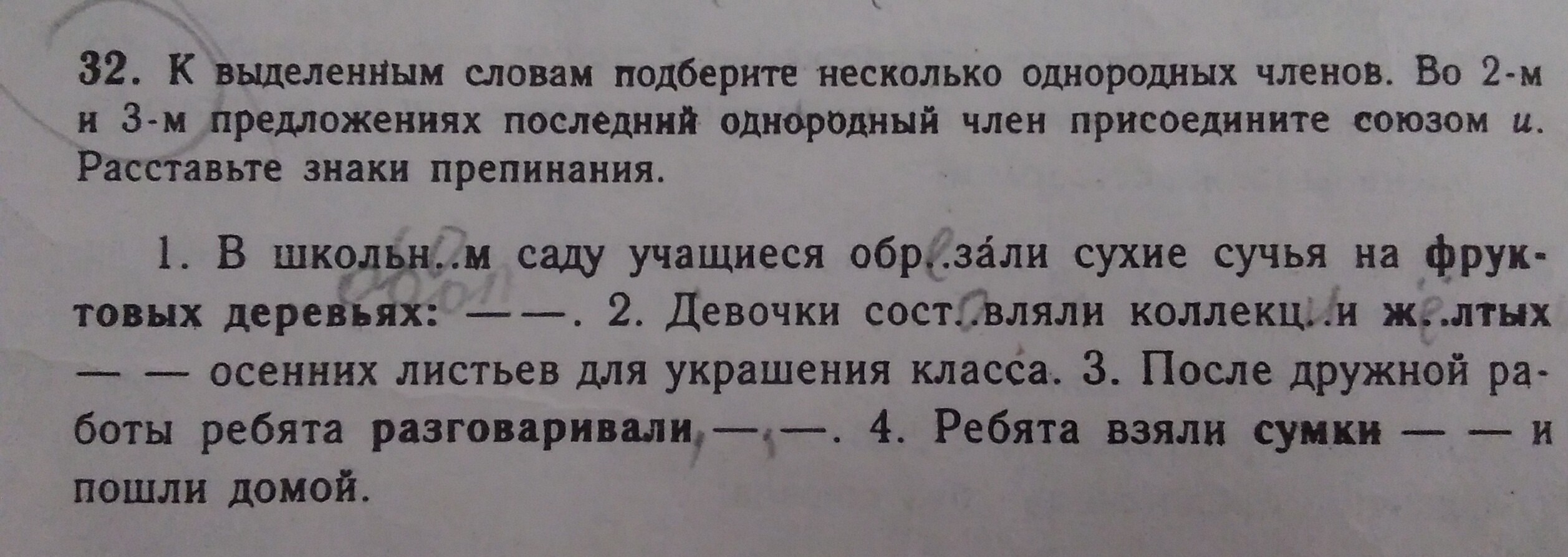 К выделенным словам подберите несколько однородных членов. Во 2-м и 3-м предложениях последний однородный член присоедините союзом и. Расставьте знаки препинания.