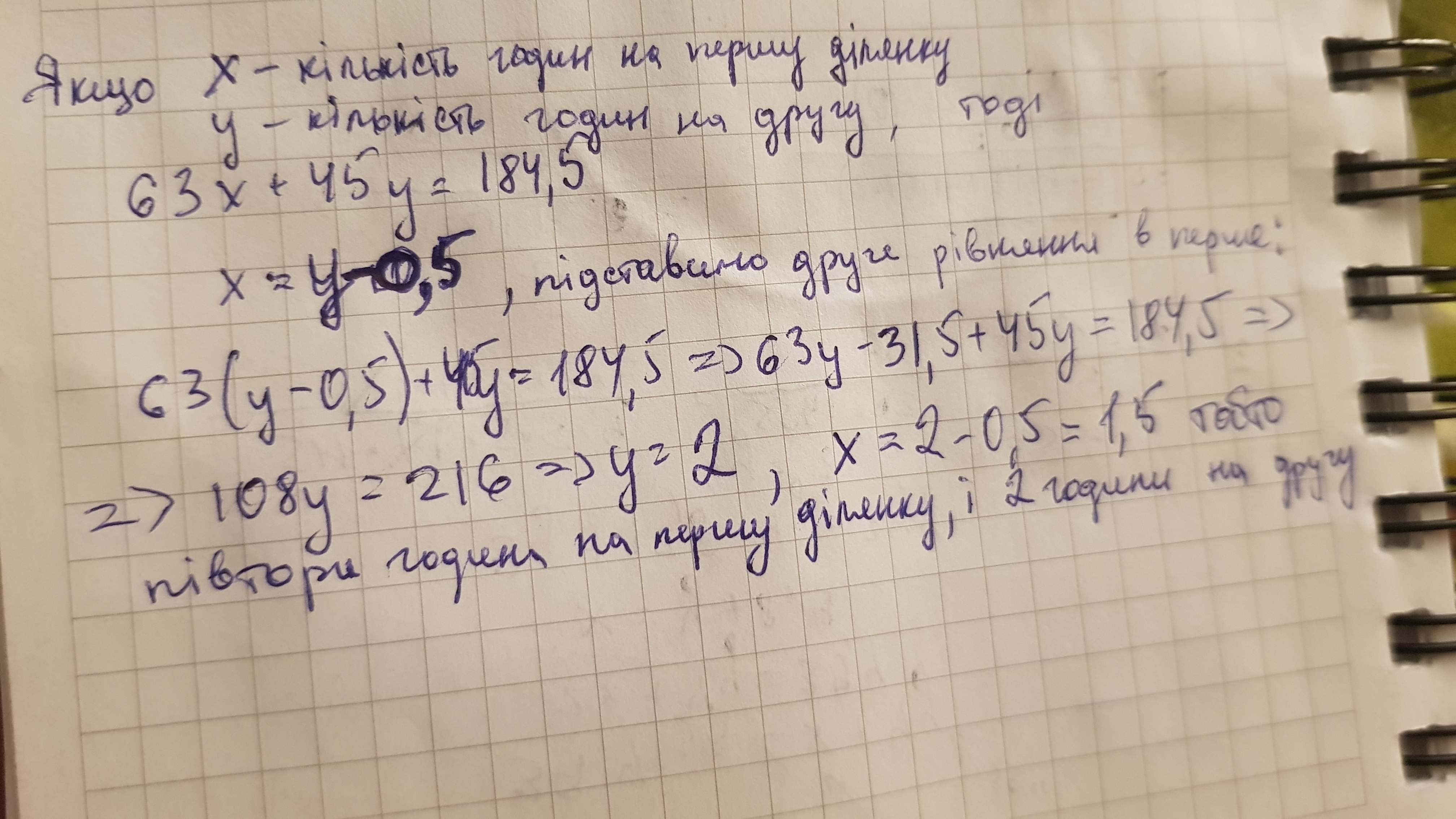 першу ділянку шляху мотоцикліст долав зі швидкістю 63км/годин,а другу-зі швидкістю 45 км/год. Загалом він подолав 184,5 км. За скільки годин мотоцикліст проїхав першу ділянку шляху і за скільки другу,якщо на першу ділянку він витратив на 0.5 год менше,ніж на другу?