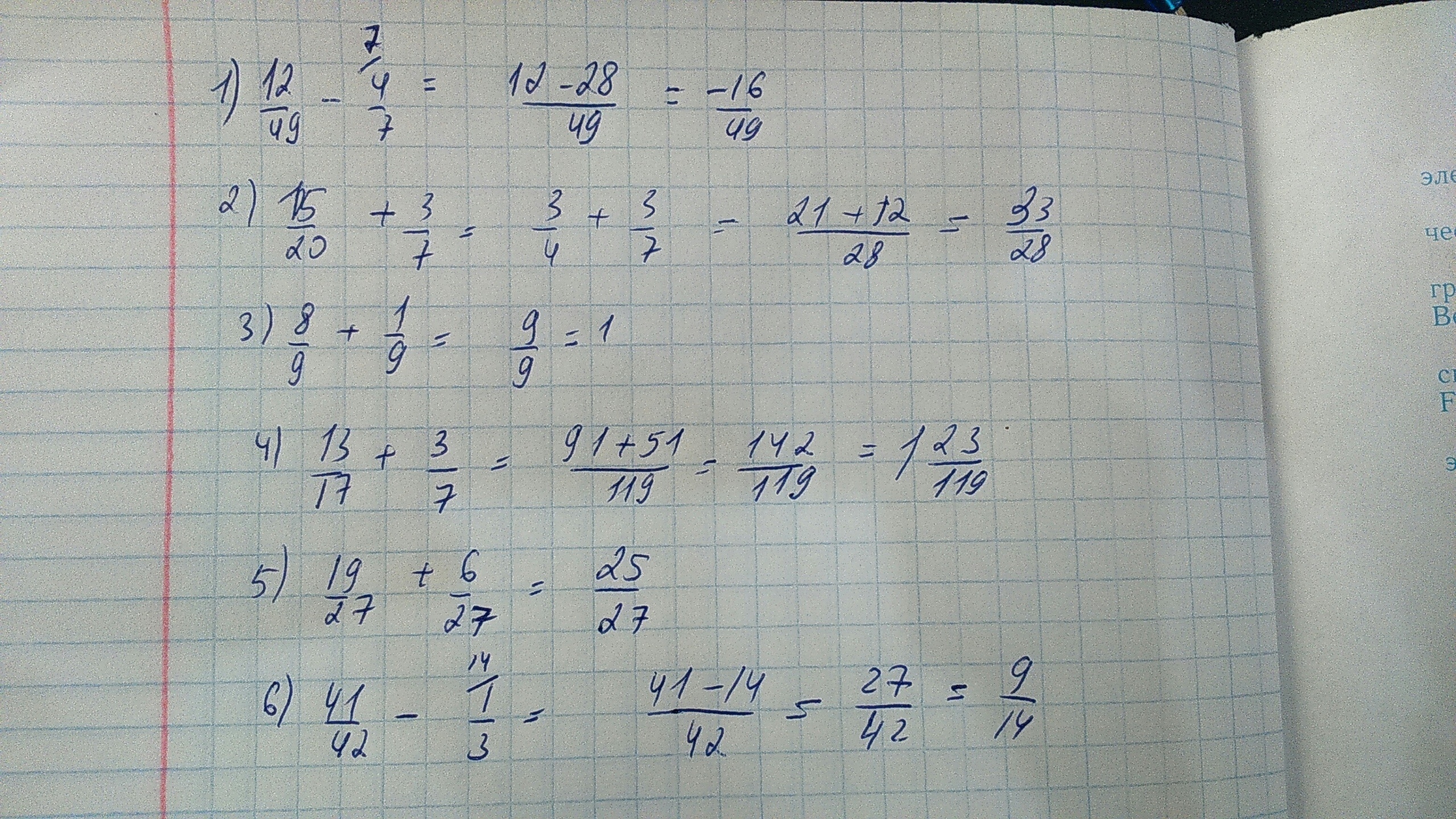 Помагите пожалуста срочно. Ришить : 1)12/49-4/7= 2)15/20+3/7= 3)8/9+1/9= 4)13/17+3/7= 5)19/27+6/27= 6)41/42-1/3=