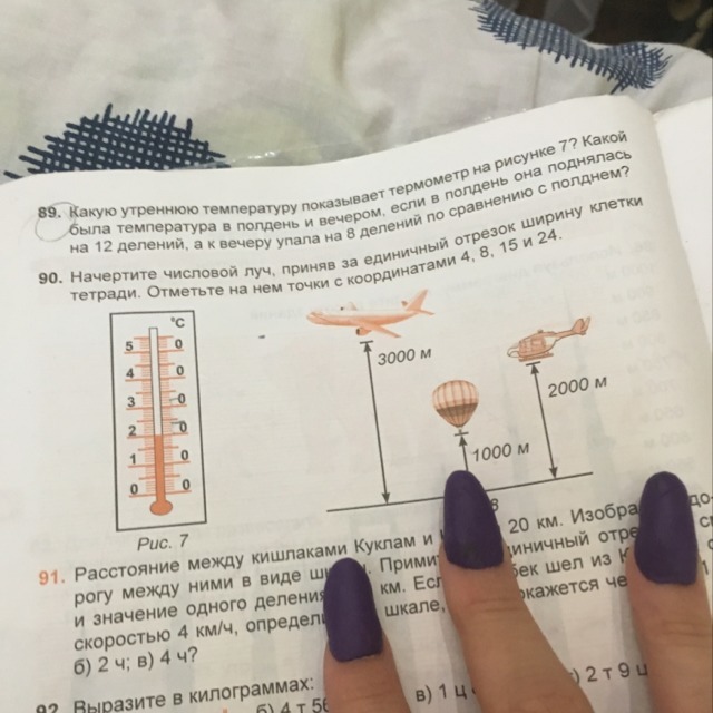 На рисунке 7 термометр показывает 20 градусов. В полдень 32 градуса ( 20 + 12) , а вечером 24 градуса ( 32 - 8).