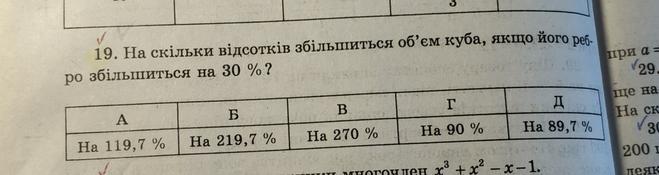 если ребро увеличить на 30% , то V=(0,3*a)^3 =0,27*a^3 . Следовательно ответ - В (на 270%).