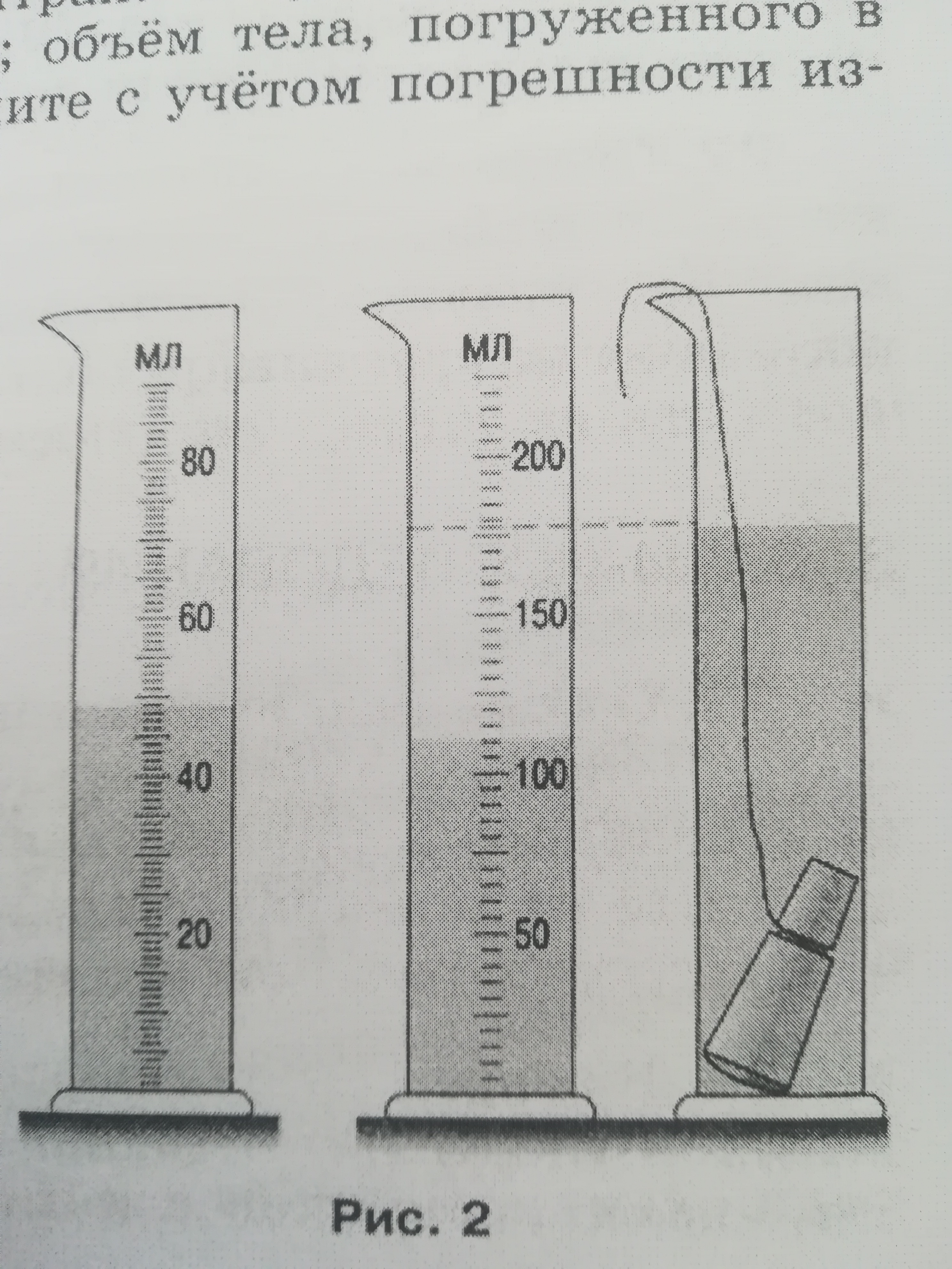 Определите цену деления и предел измерения каждой из мензурок, изображенных на рисунке, если их вместимость выражена в миллилитрах. Чему равен объем воды, налитой в каждую мензурку; объем тела, погруженного в мензурку? Результаты запишите с учётом погрешности измерения.