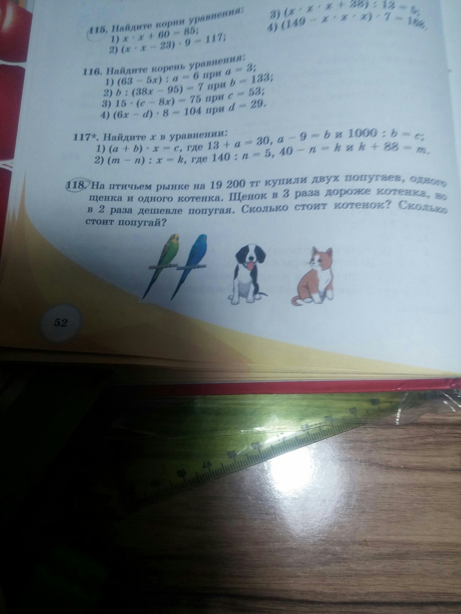 пусть котенок стоит x тг, щенок 3x, попугай 2*(3х)=6х, т.к. 1 щенок (3х) + 1 котенок (х) + 2 попугая (2*6х) =19200 тг, то имеем уравнение