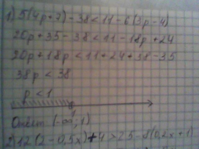1)20p+35-38<11-18p+24, 38p<38 ,p<1 . 3)8,4 - 5,6q - 0,64 < 15,4 + 1,6q - 8 , 7,2q>0,36 q>0.05