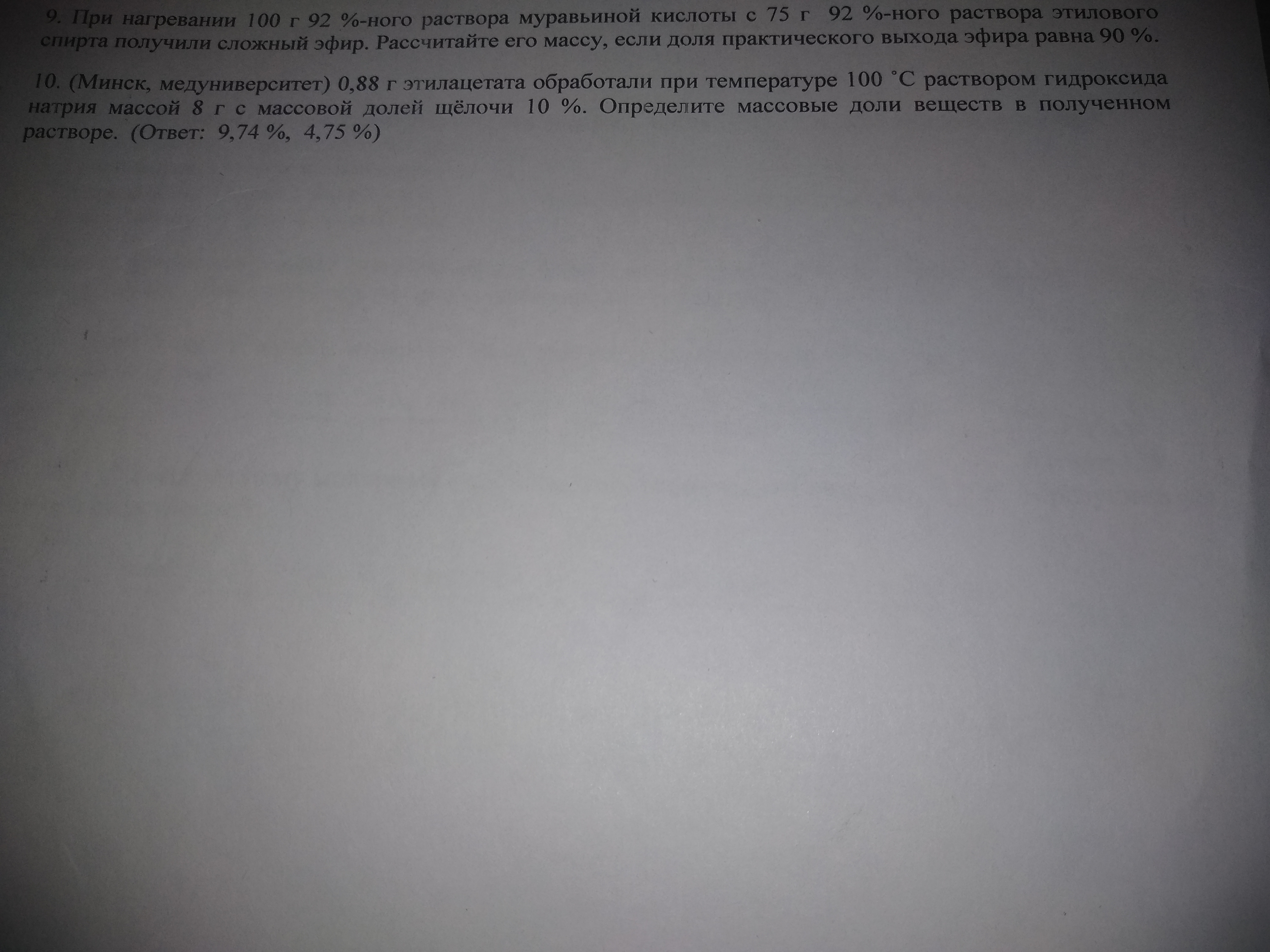 Таким образом, у нас прореагируют 0,01 моль этилацетата (то есть весь) и 0,01 моль натрия гидроксида (0,01 моль или 0,4 г не прореагирует), получится 0,01 моль ацетата натрия и 0,01 моль этилового спирта.