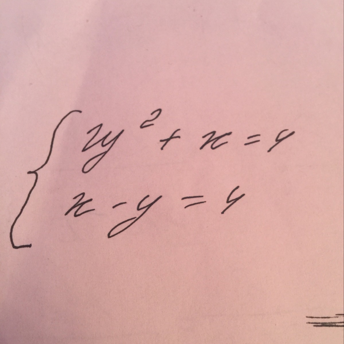 x=y+4. подставляем в 1 уравнение: 2y^2+(y+4)=4; 2y^2+y+4-4=0; 2y^2+y=0. y*(2y+1)=0. y=0 или 2y+1=0. y1=0, y2= -1/2. x1=0+4=4, x2= -1/2+4=3 1/2. Ответ: (4:0), (3 1/2; -1/2).