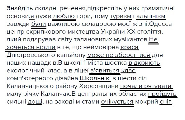 Знайдіть складні речення,підкресліть у них граматичні основи.я дуже люблю гори, тому туризм і альпінізм завжди були важливою складовою моєї жізні.Одесса центр скрипкового мистецтва України ХХ століття, який подарував світу талановитих музікантов.Не хочеться вірити в те, що неймовірна краса Дністровського каньйону може не зберегтися для наших нащадків.В школі 1 міста шостка відкриють екологічний клас, а в ліцеї з'явиться клас комп'ютерного дізайна.Школьнікі з шести сіл Каланчацького району Херсонщини почали рятувати малу річку Каланчак.В центральних областях пройдуть сильні дощі, на заході м стами очікується мокрий сніг.