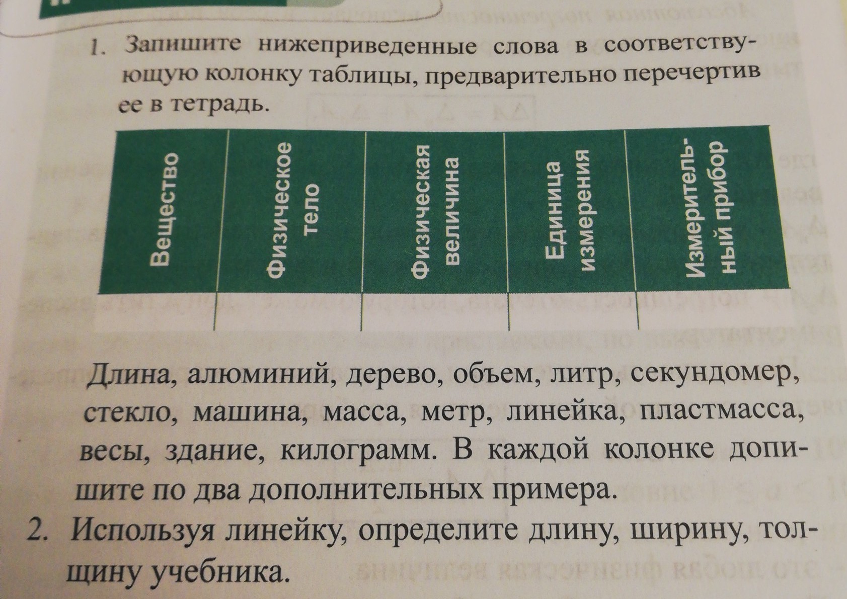 Вещество: алюминий, стекло, пластмасса. Физическое тело: дерево, машина,ленейка,весы, здание. Физич величена:объём, масса, длинна. Единица измерения: литр, метр, килограмм. Измерительный прибор: ленейка, секундомер, весы.