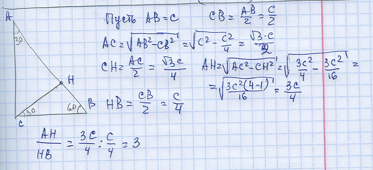 В прямоугольном треугольнике ABC с прямым углом C угол B равен 60 . Найдите отношение AH:HB, где CH — высота треугольника.