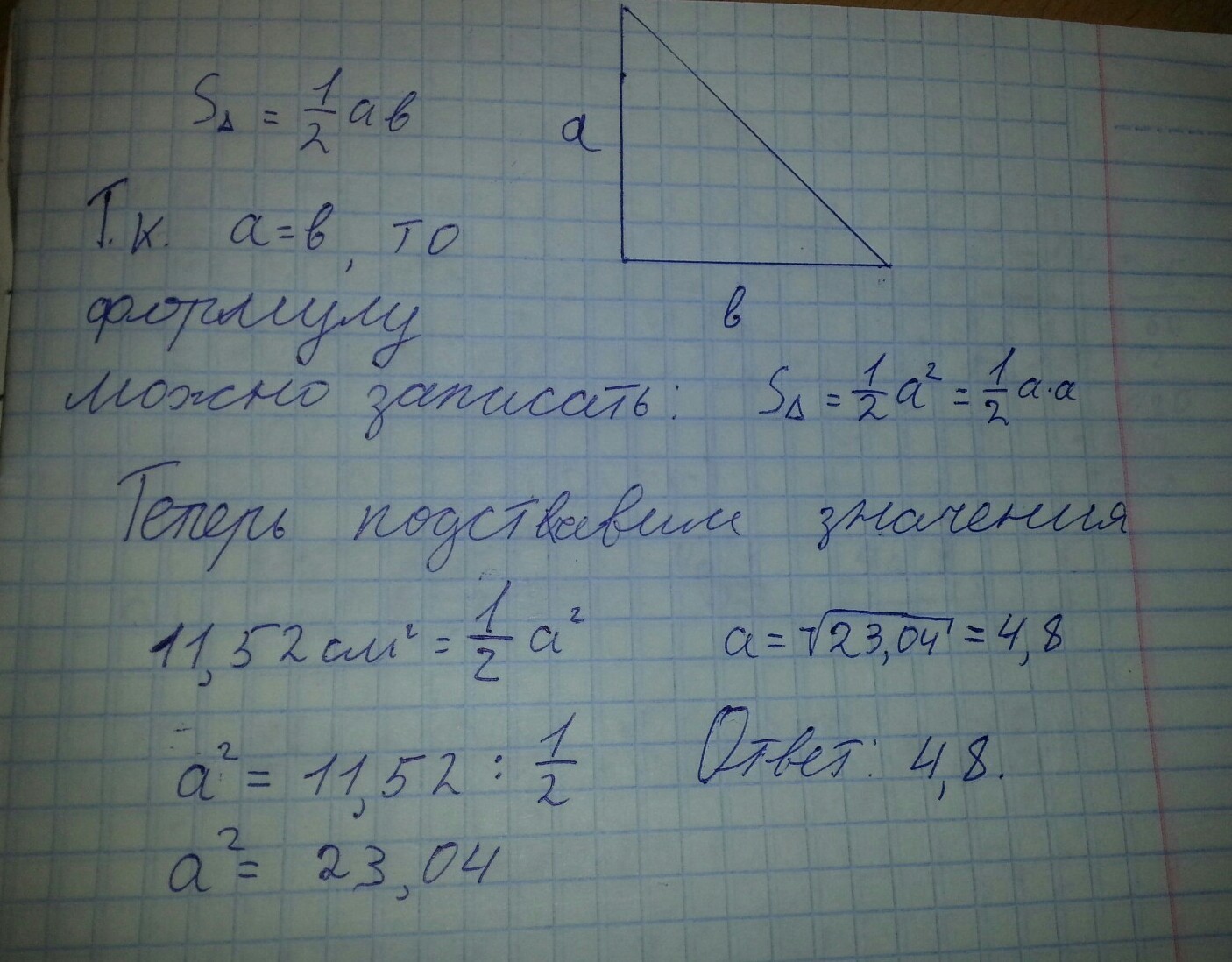 Как найти сторону(катет) равнобедренного треугольника, если дана его площадь (ответ нужно округлить до сотых)