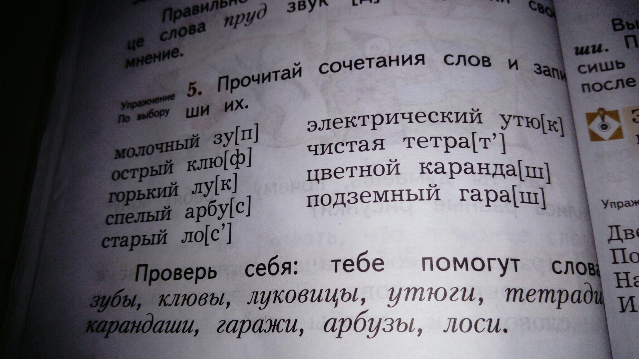 Молочный зуб; острый клюв; горький лук; спелый арбуз; старый лось; электрический утюг; чистая тетрадь; цветной карандаш; подземный гараж.