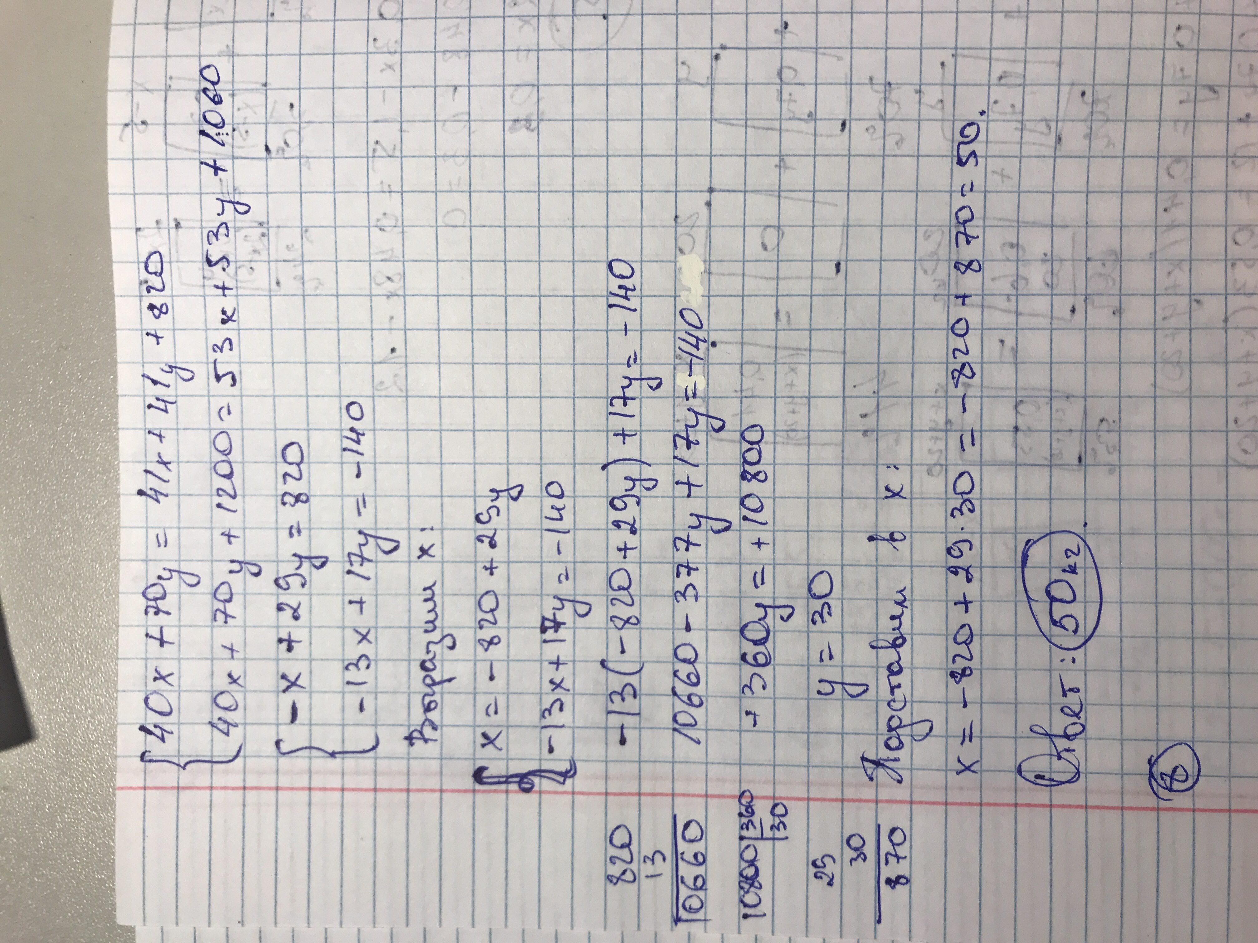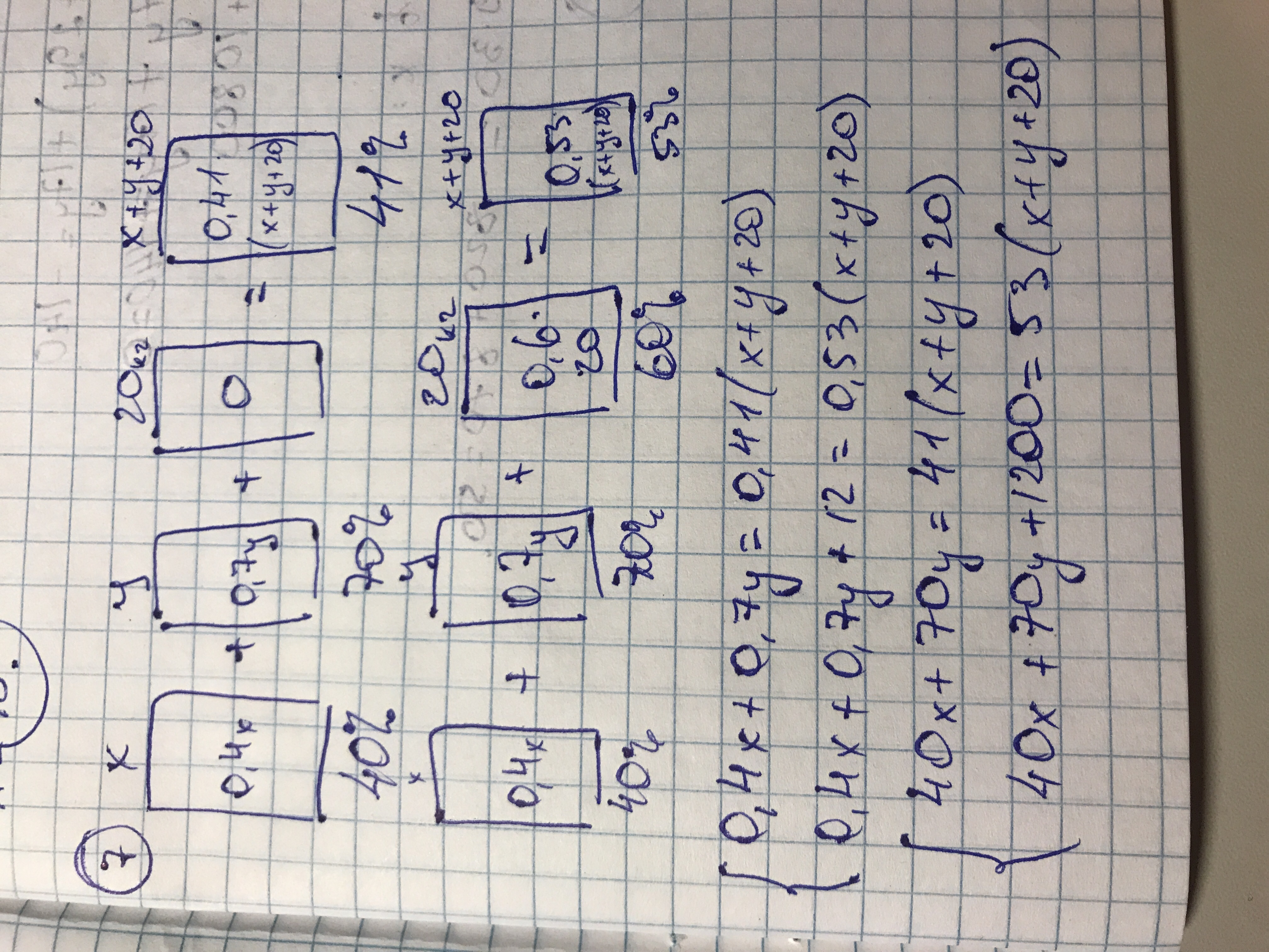 Смешав 20% и 70% растворы кислоты и добавив 20 кг чистой воды, получили 41% раствор кислоты. Если бы вместо 20 кг воды добавили 20 кг 60% раствора той же кислоты, то получили бы 53% раствор кислоты. Сколько кг 40% раствора использовали для получения смеси?