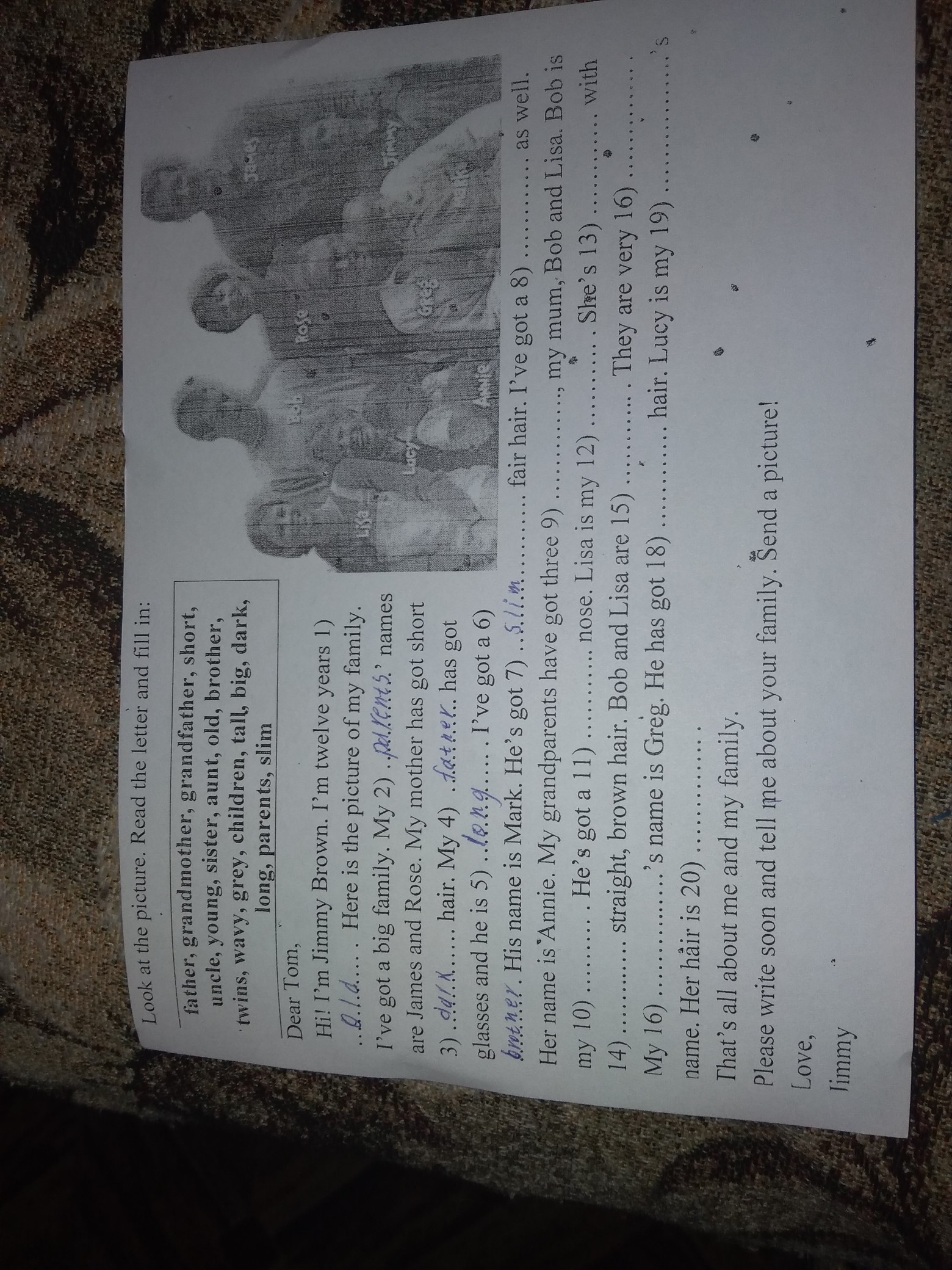 1. old 2. parents 3. dark 4. father 5. tall 6. brother 7. wavy 8. sister 9. children 10. uncle 11. big 12. aunt 13. slim 14. long 15. twins 16. young 16. grandfather 18. short 19. grandmother 20. grey