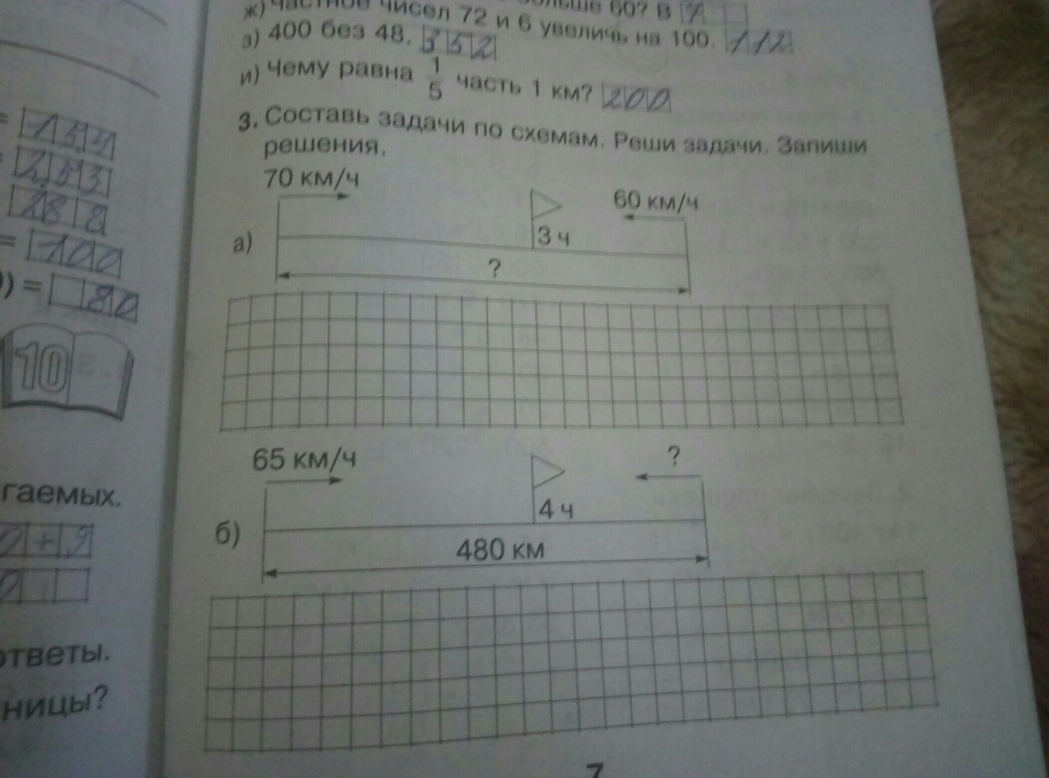 Из двух городов на встречу друг другу выехали два автомобиля. Скорость первого автомобиля 70км/ч, скорость второго автомобиля 60км/ч. Через 3ч автомобили встретились. Какое расстояние между городами? 1)70*3=210км-проехал первого автомобиля 2)60*3=180км-проехал второй автомобиль 3)210+180=390км-расстояние между городами Ответ:390км ----------------------------------- Из двух городов расстояние между которыми 480км выехали навстречу друг другу пассажирский и товарный поезда, через 4часа поезда встретились. Скорость пассажирского поезда 65км/ч. Найти скорость товарного поезда? 1)65*4=260км-проехал пассажирский поезд 2)480-260=220км-проехал товарный поезд 3)220:4=55км/ч-скорость товарного поезда Ответ:55км/ч