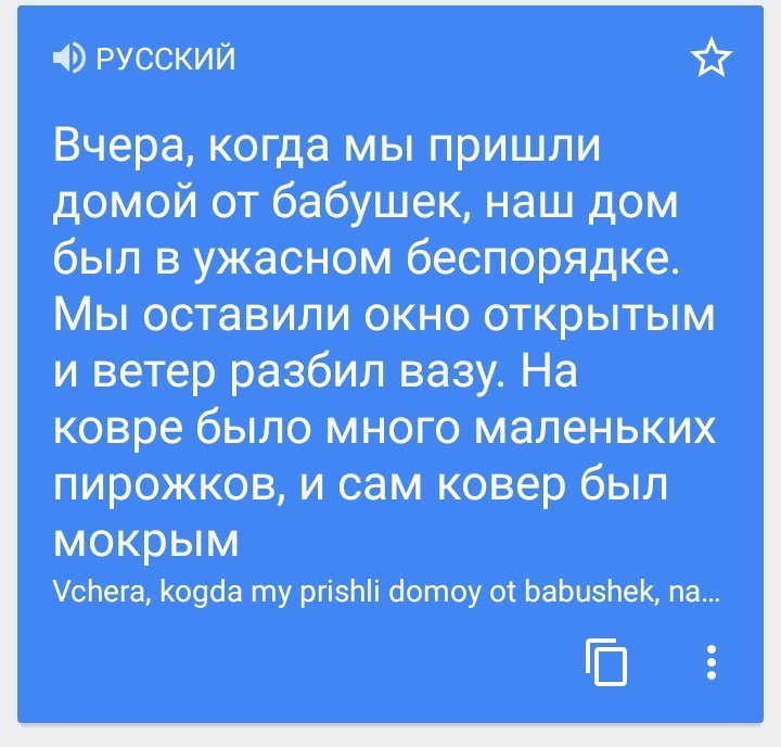 Когда мы вчера вернулись домой от бабушки, в нашей комнате был ужасный беспорядок. Мы оставили окно открытым, и ветер разбил вазу. Было много маленьких кусочков стекла на ковре, и сам ковер был мокрым.