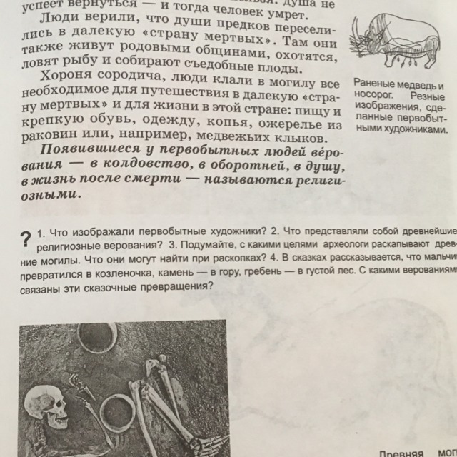 В пещерах находят изображения животных, например, мамонтов. Древние охотники рисовали их на стенах и протыкали копьями - это гарантировало удачу на охоте.2)Древнейшие религиозные верования представляли собой веру во многих богов. . Что называется язычество..